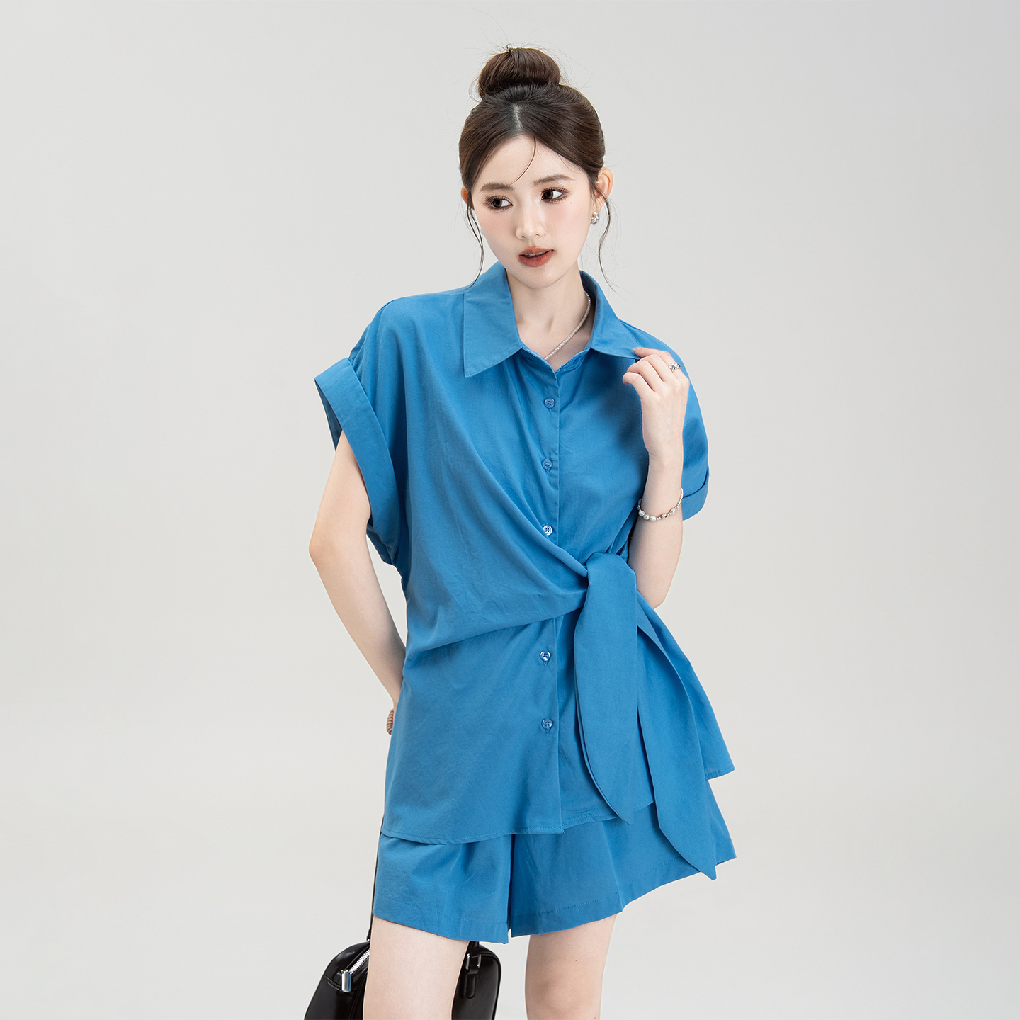 衬衫 套装 女夏季 宽松休闲短裤 新款 克莱因蓝韩系不规则绑带收腰短袖