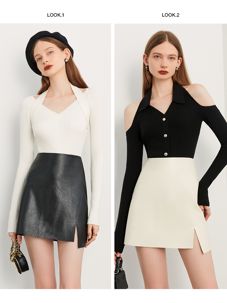 经典 简约个性 黑不对称下摆开衩高腰A字皮裙 新款 DPLAY夏季