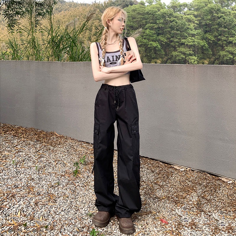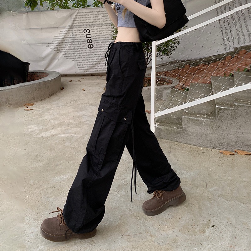 ins潮小个子宽松直筒阔腿裤 RNBN黑色美式 女新款 裤 高腰工装