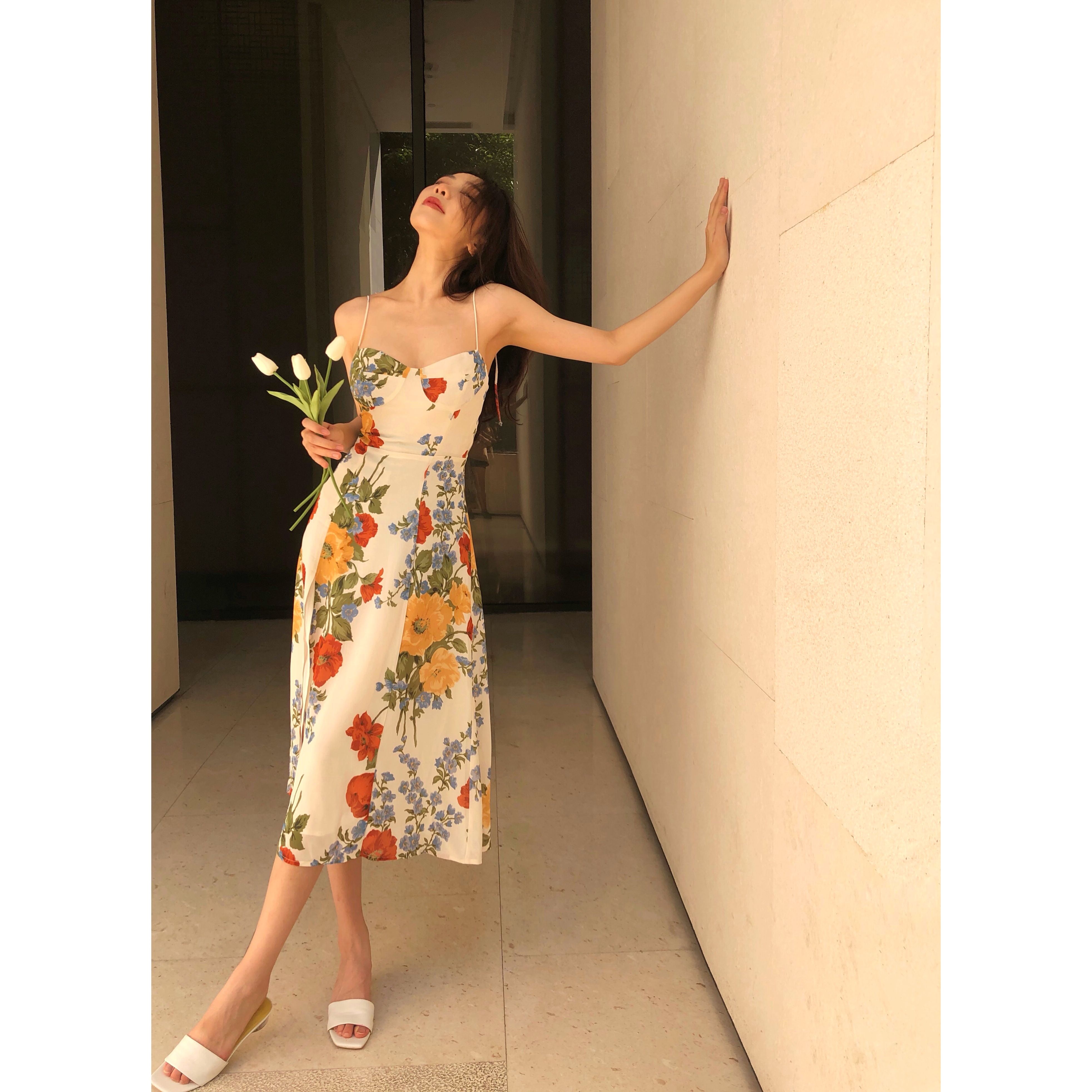 显瘦纯欲风裙子 修身 复古碎花吊带连衣裙女夏季 气质名媛开衩中长款