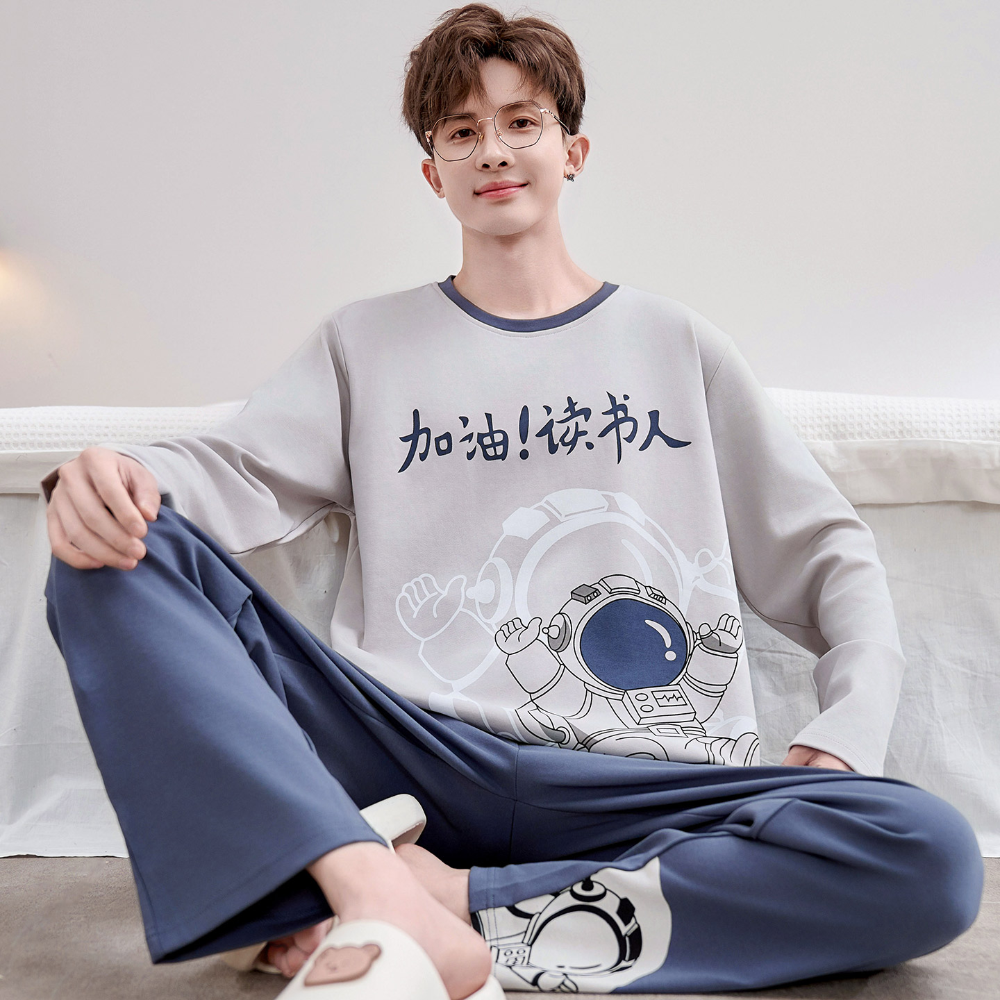 纯棉长袖 休闲学生套装 青少年家居服男士 大码 夏天薄款 睡衣男春秋季