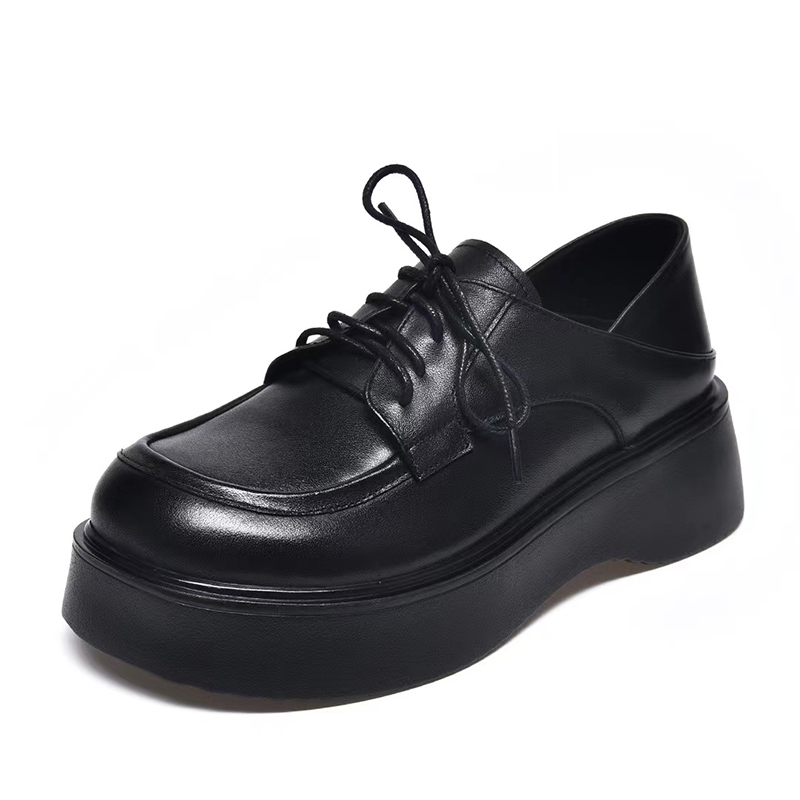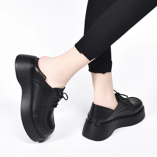 头层牛皮厚底舒适真皮单鞋 休闲春秋季 防水台 时尚 英伦风系带乐福鞋