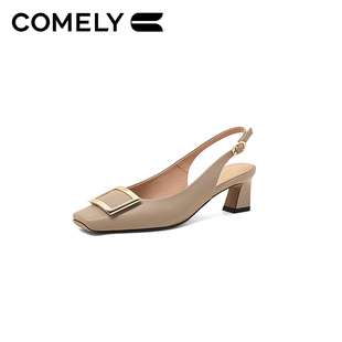 女2024春季 高跟鞋 商场新款 时尚 方扣真皮方头单鞋 康莉粗跟包头凉鞋