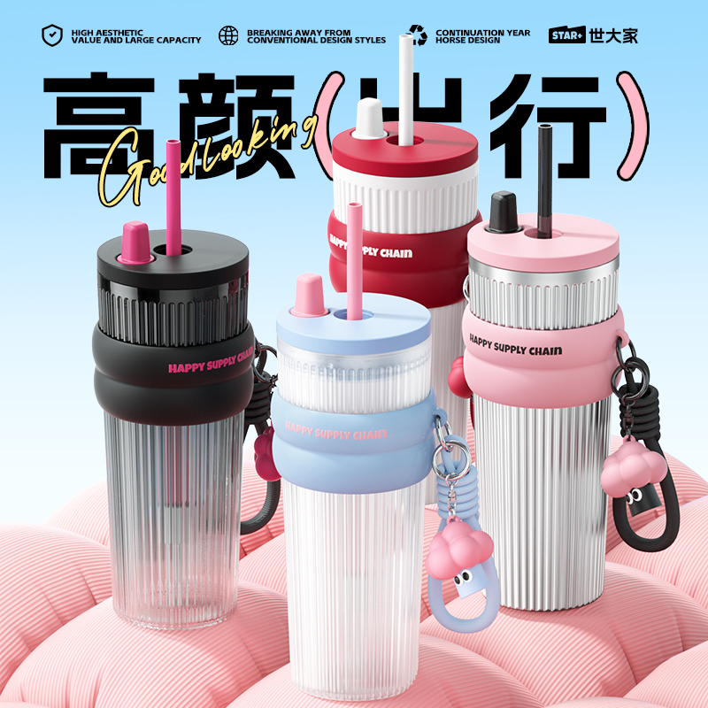bociya保温杯水杯女高颜值新款 小巧便携学生儿童吸管双饮咖啡杯子