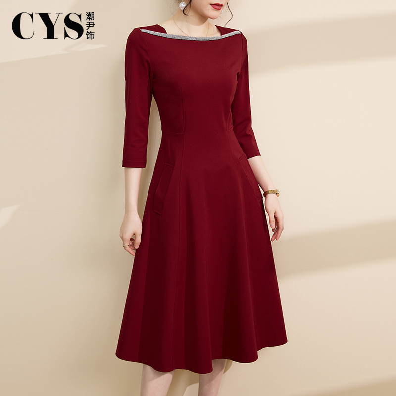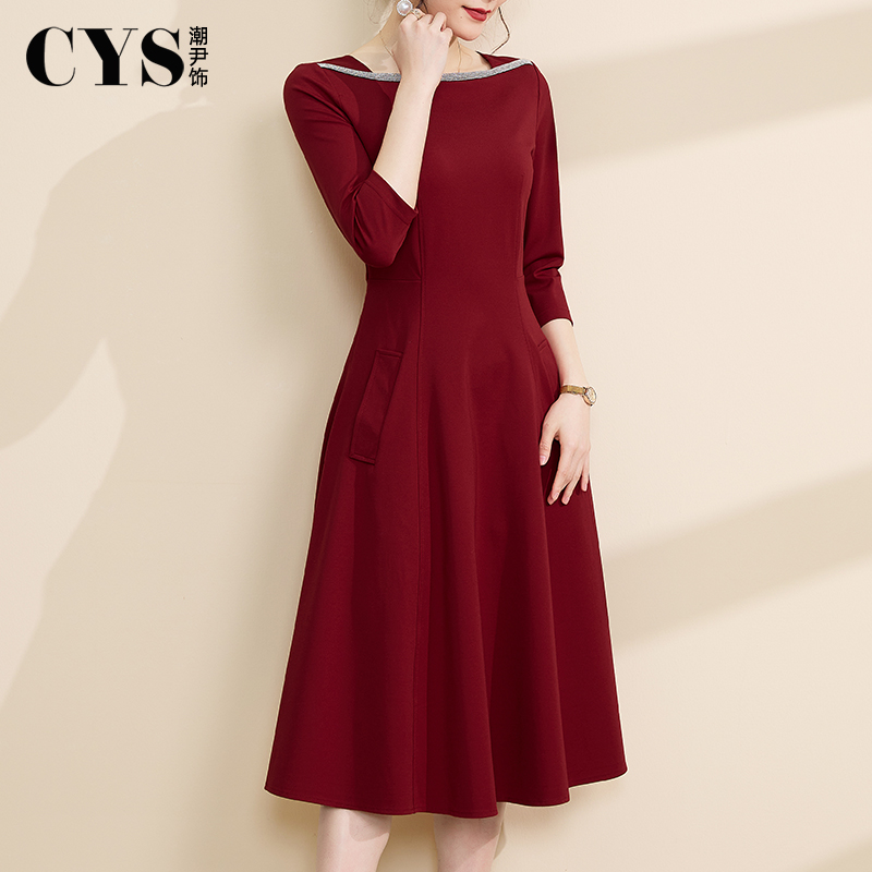 新品 OCHIRLY欧时力 100%羊毛一字领毛织连衣裙女长裙露肩2025秋季