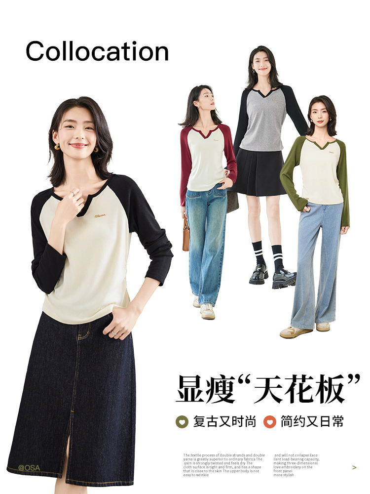 插肩长袖 美式 T恤女拼接撞色v领显瘦复古内搭上衣 新款 OSA欧莎秋季