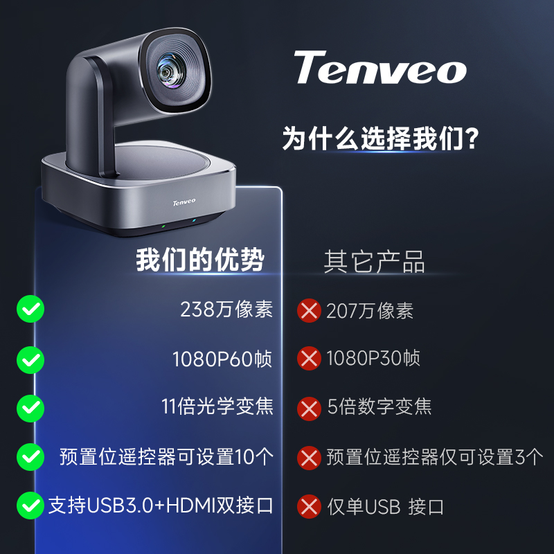 Tenveo腾为视频会议摄像头1080P高清11倍光学变焦广角会议室摄影头腾讯会议摄像机远程套装 USB免驱系统设备