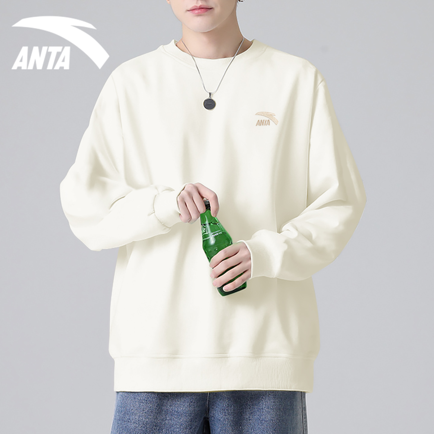 青少年官方旗舰运动长袖 安踏卫衣男士 圆领灰色套头衫 新款 T恤 秋季
