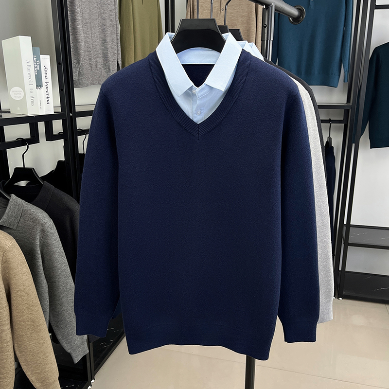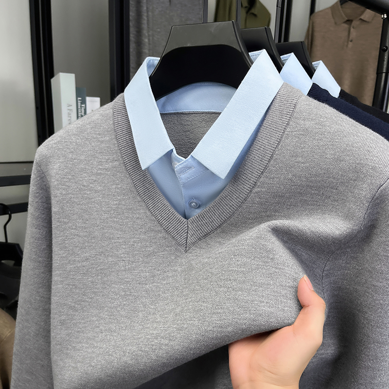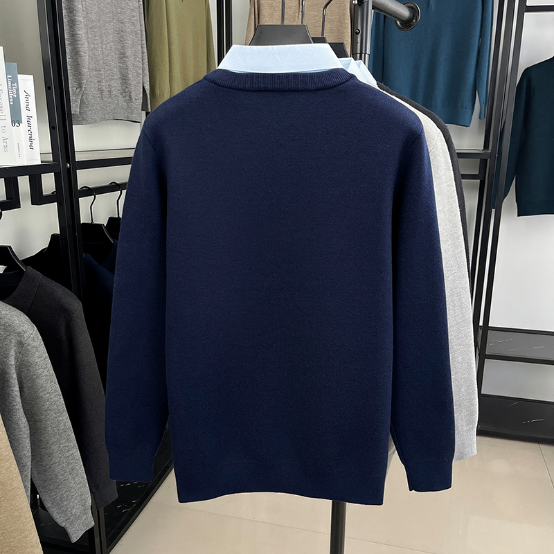 中老年人爷爷装 秋冬季 假两件保暖针织衫 中年爸爸毛衣加绒加厚男士