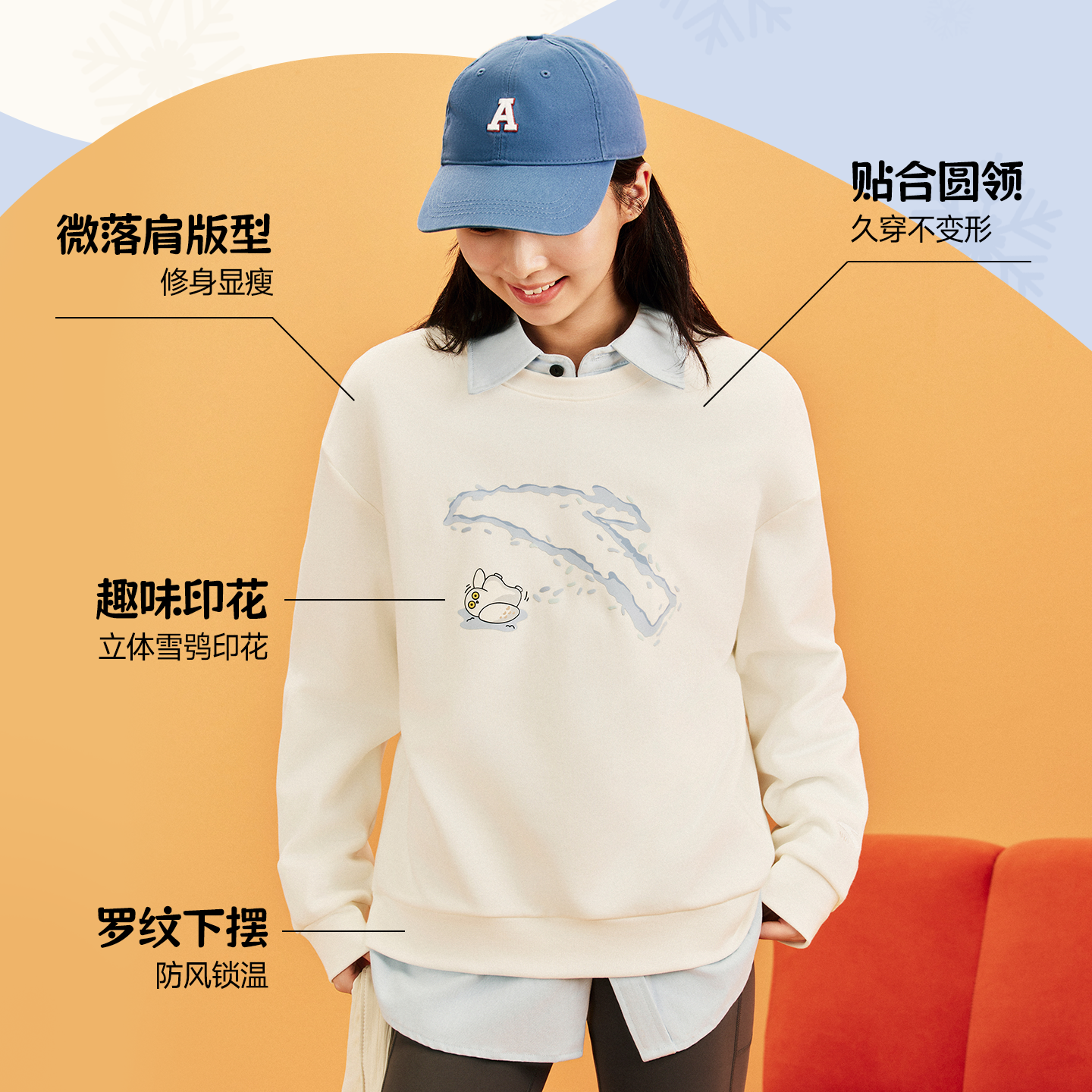 新款 女冬季 加绒休闲宽松多巴胺运动上衣 减龄套头衫 安踏雪鸮卫衣