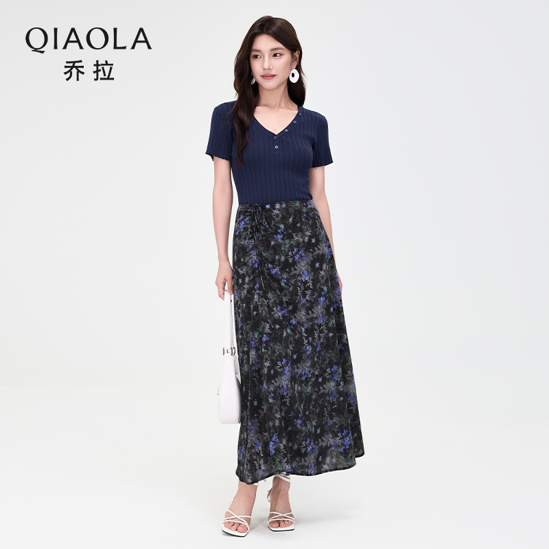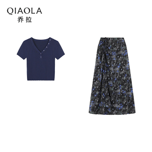 冰霜蔷薇 上衣裙子套装 2025夏季 藏蓝色条纹V领短袖 女 新款 乔拉