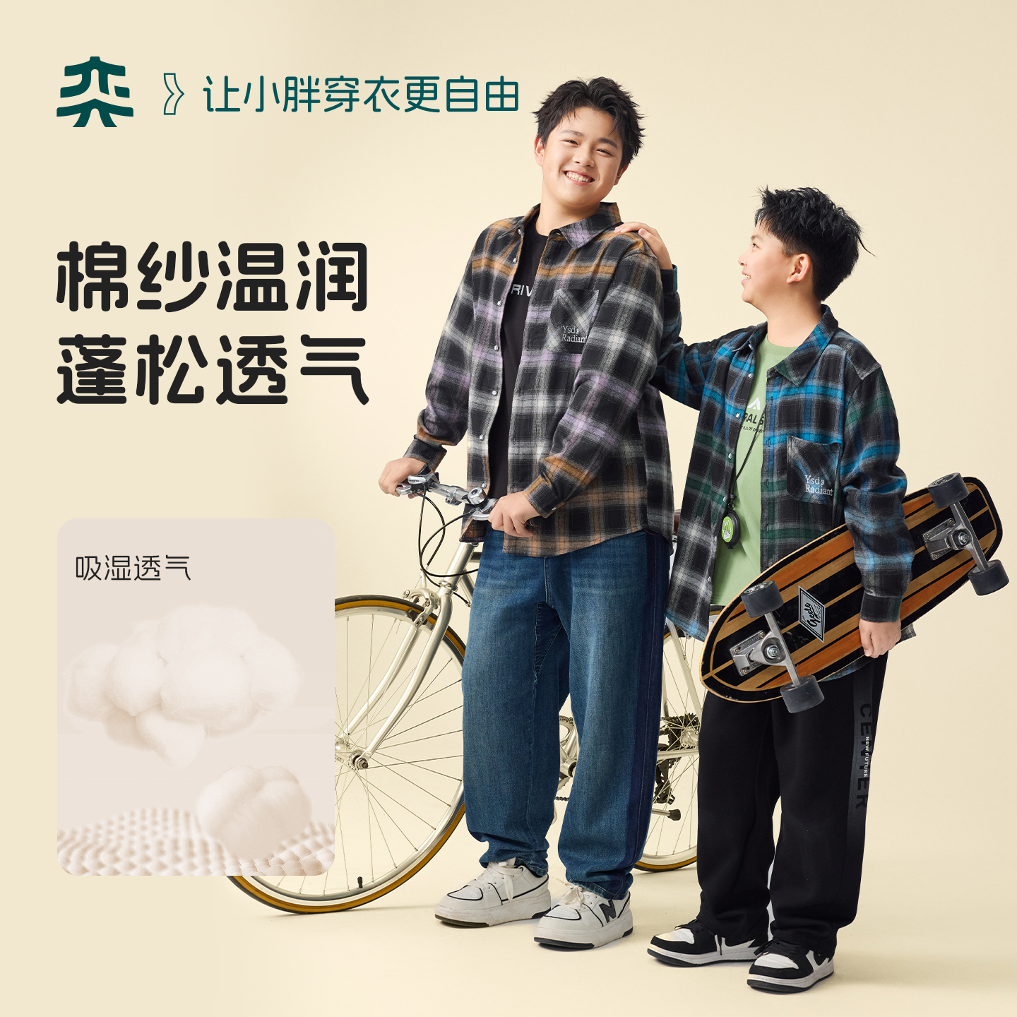 中大童长袖 奕时代胖男童格子衬衫 衬衣男孩外套秋 格子棉绒衬衫