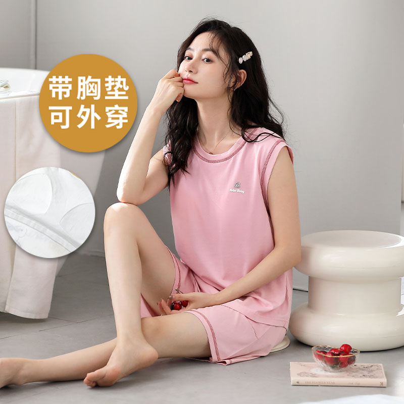 套装 浪莎带胸垫睡衣女夏季 韩范家居服可外穿薄款 短裤 纯棉背心无袖