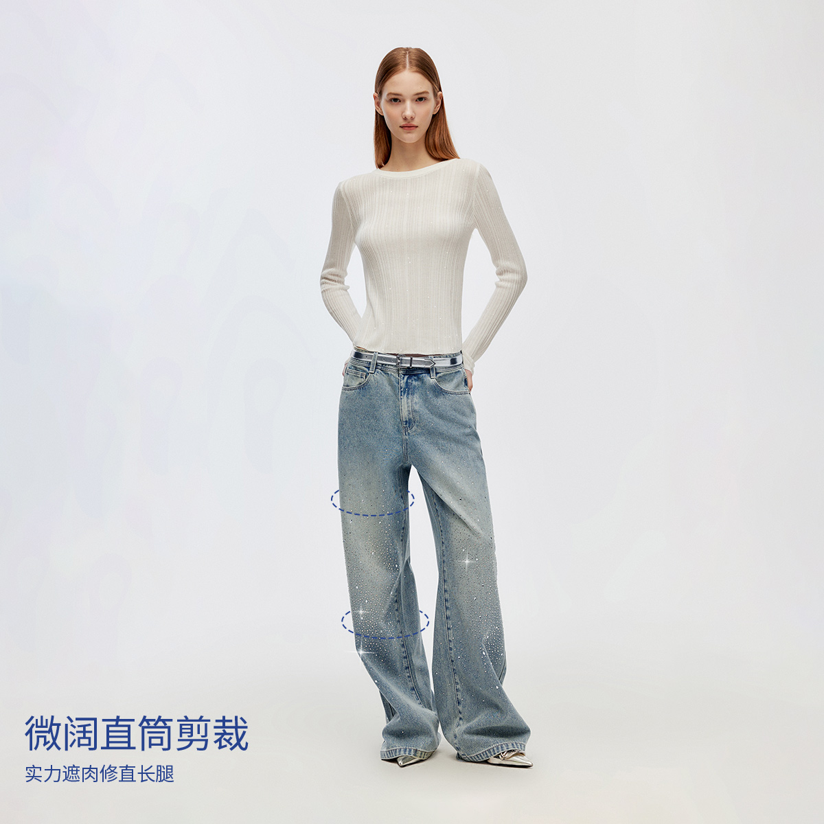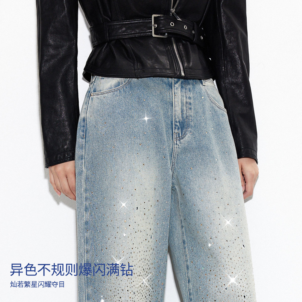 新款 ONLY2025秋季 莱赛尔重工烫钻高腰宽松直筒牛仔裤 爆闪神裤