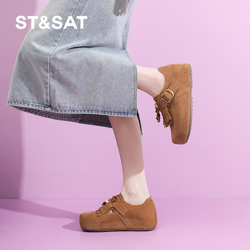 温柔风配裙子豆豆鞋 新款 女2024秋季 星期六真皮平底蝴蝶结浅口单鞋
