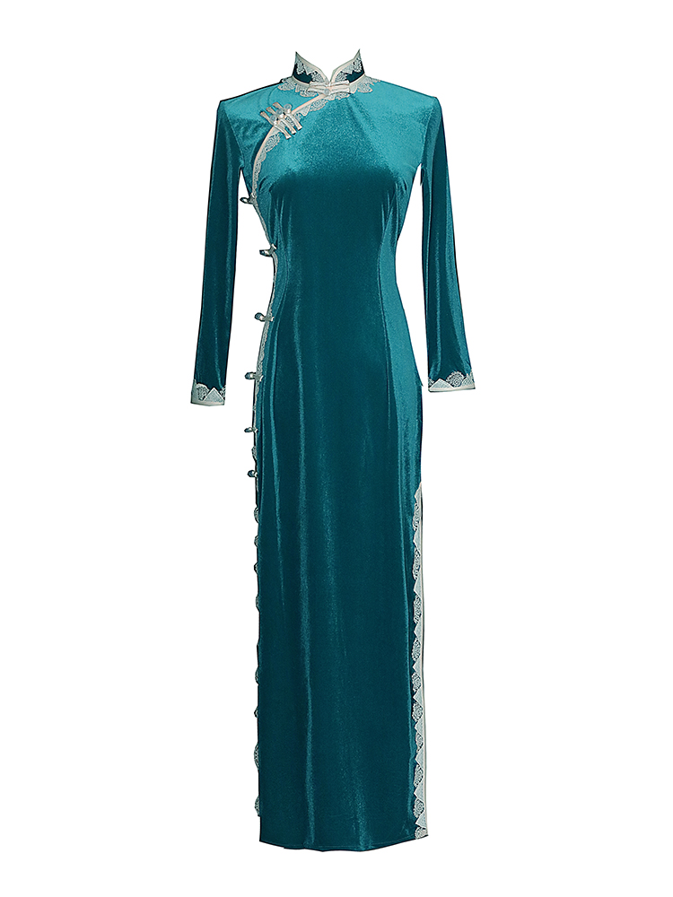高端气质秋冬中长款 蓝色旗袍新款 年轻款 女秋装 丝绒连衣裙 2023新款