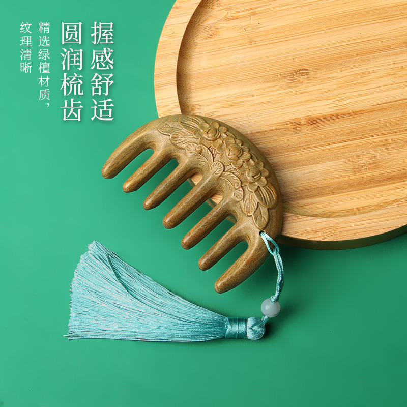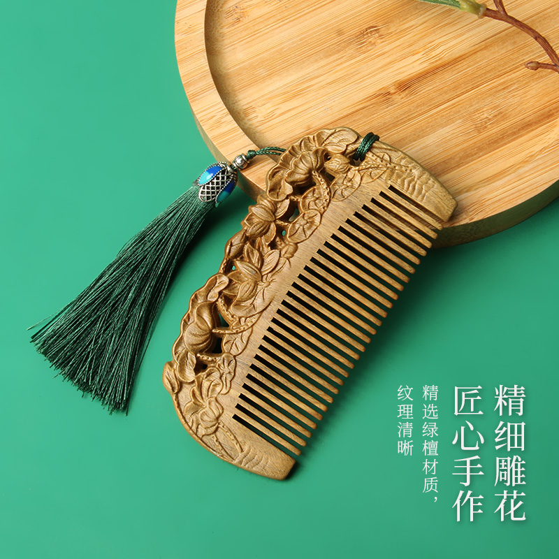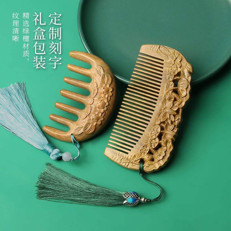 小李子绿檀木梳子双面雕花复古风头部经络按摩梳套装 送女友礼物