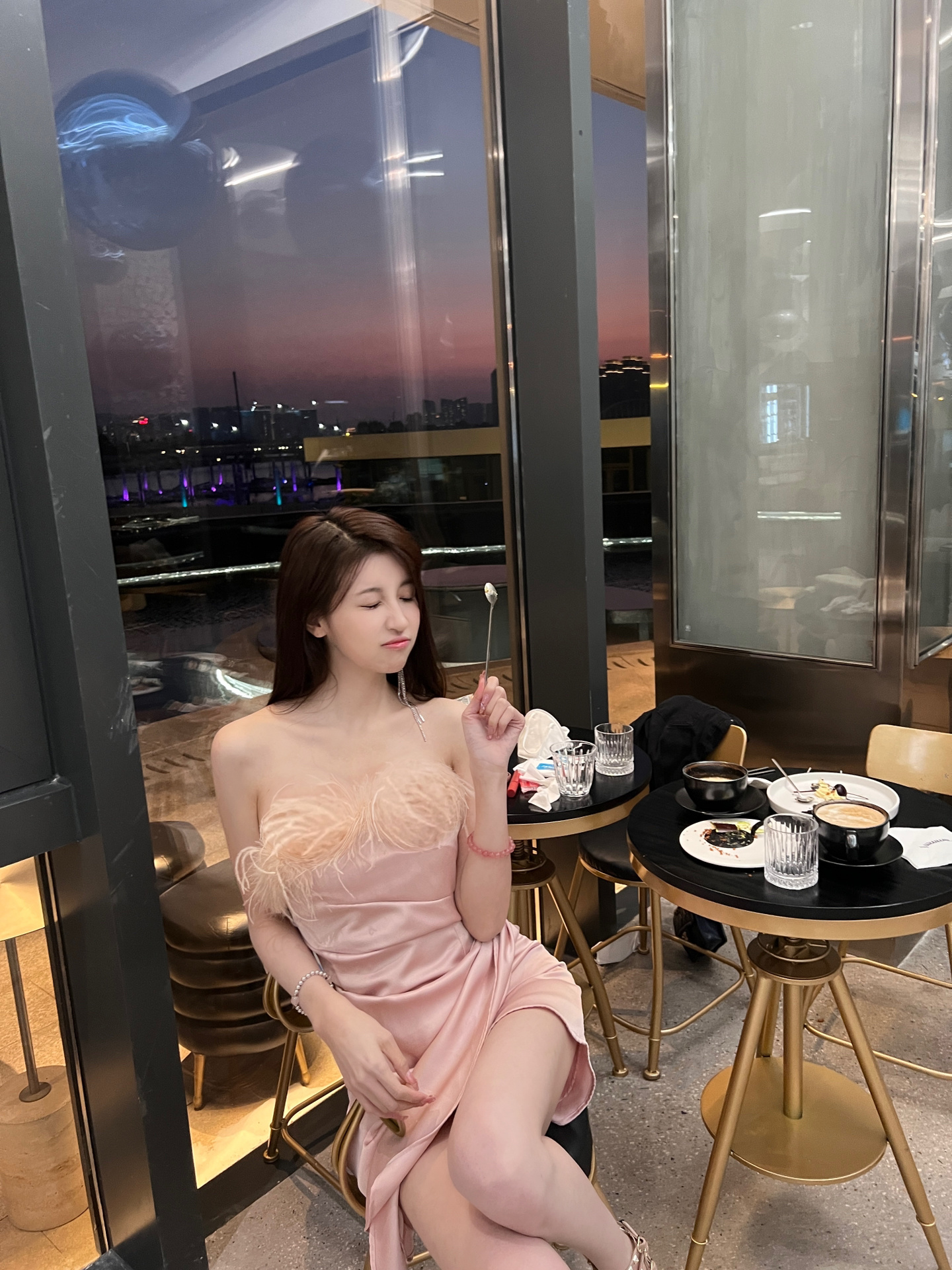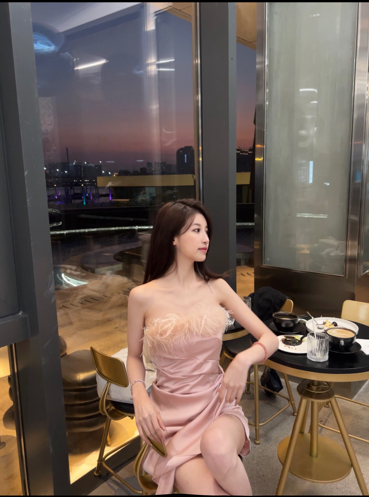 生日party小礼服裙法式 气质高级感绸面一字肩鸵鸟毛抹胸连衣裙女