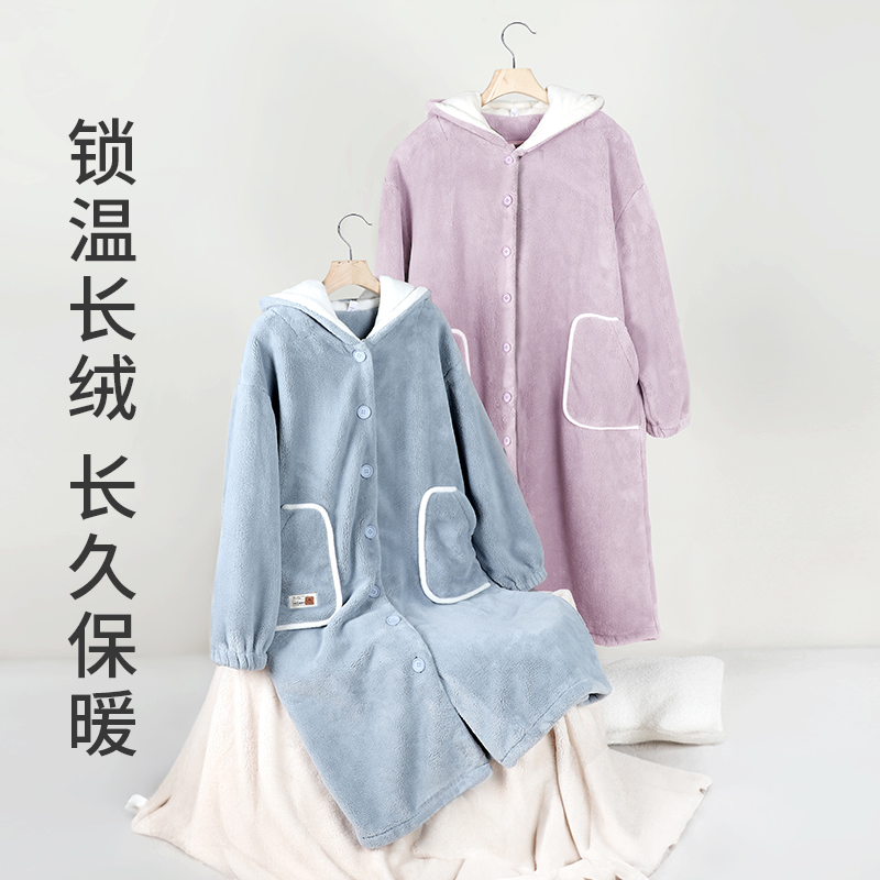 新一步美狐绒睡袍女士2025秋冬保暖连帽中长款 珊瑚绒加厚居家服装
