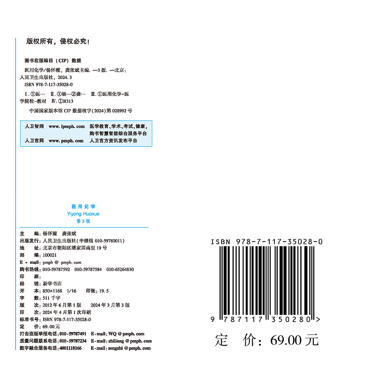 人民卫生出版 9787117350280 医用化学 配增值 杨怀霞 本科中医药类 平装 第3版 社 正版 龚张斌 全新