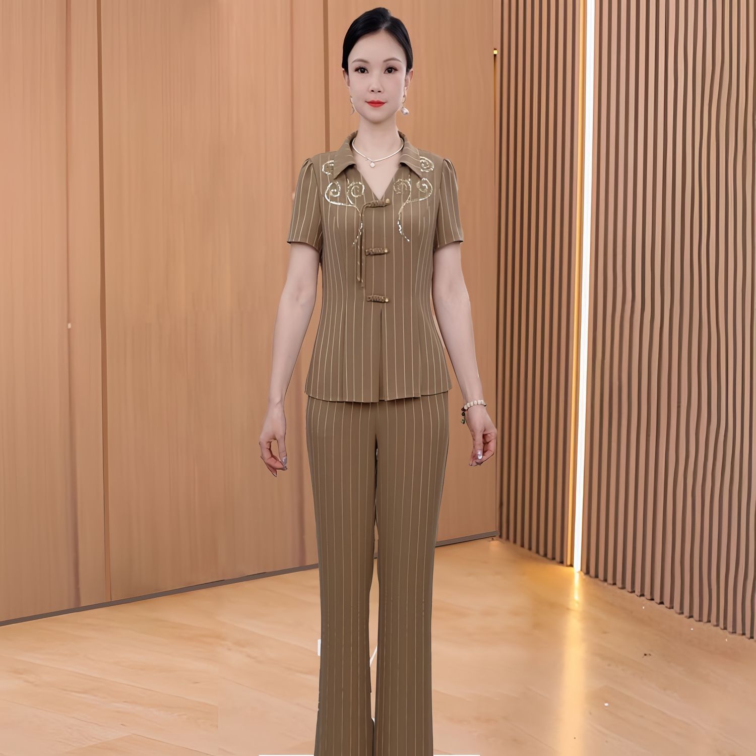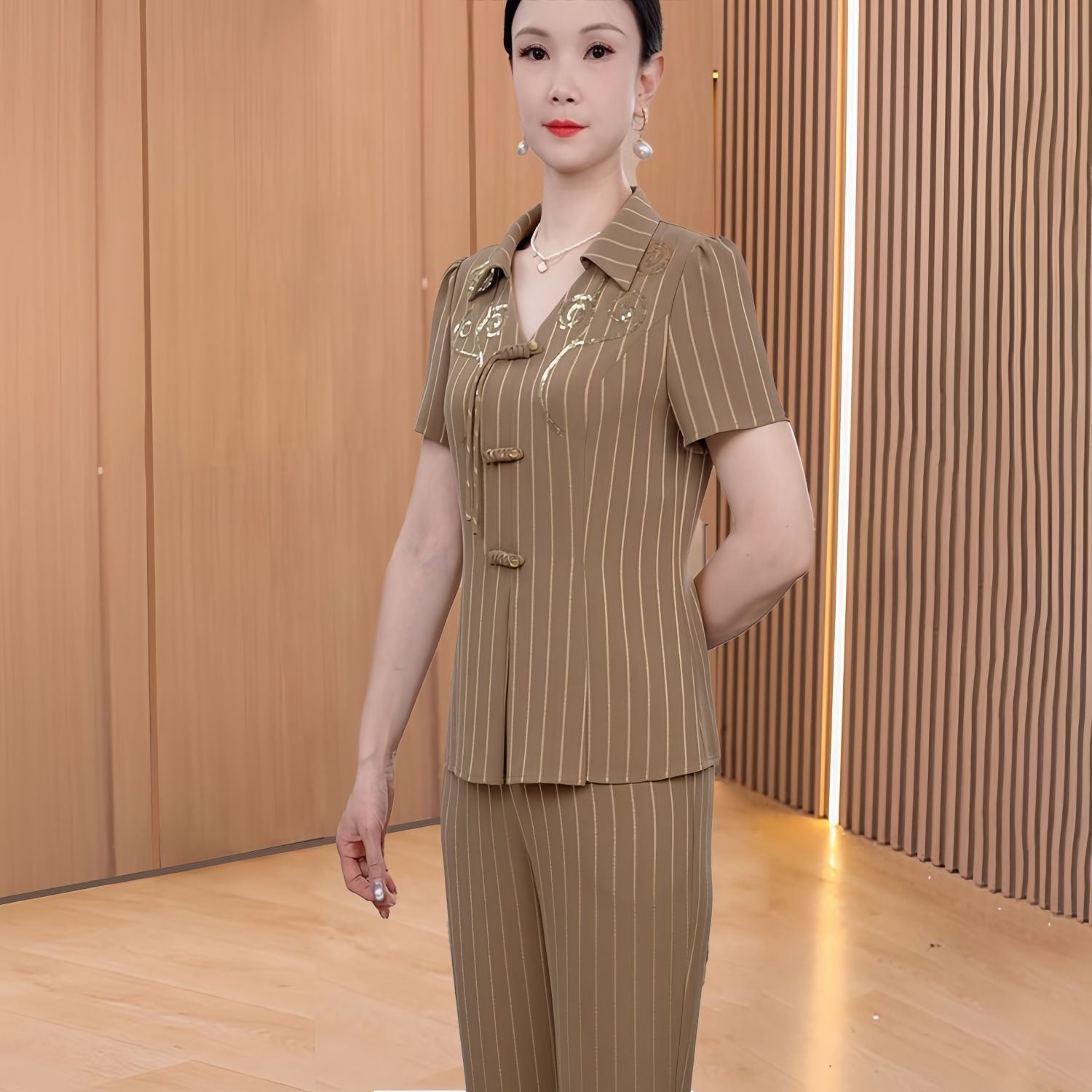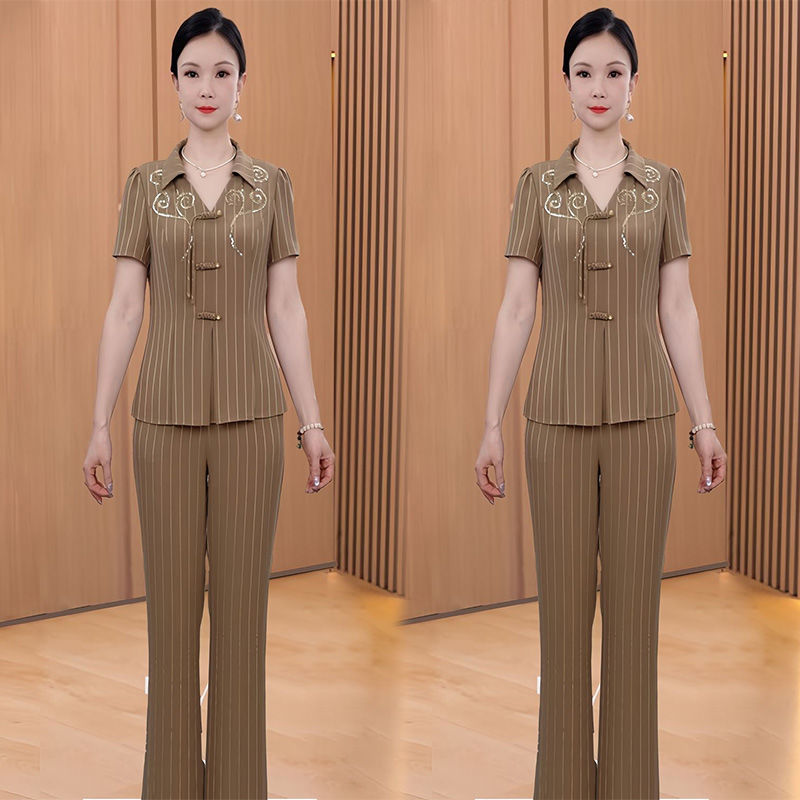 套装 国风v领盘扣上衣裤 2024夏季 新中式 子两件套 新款 中年妈妈时尚