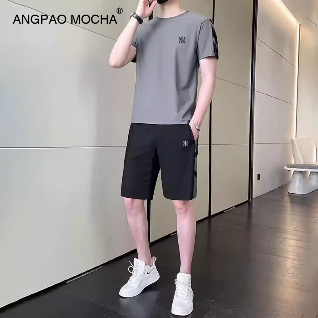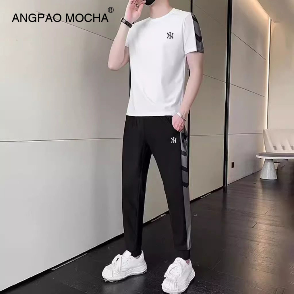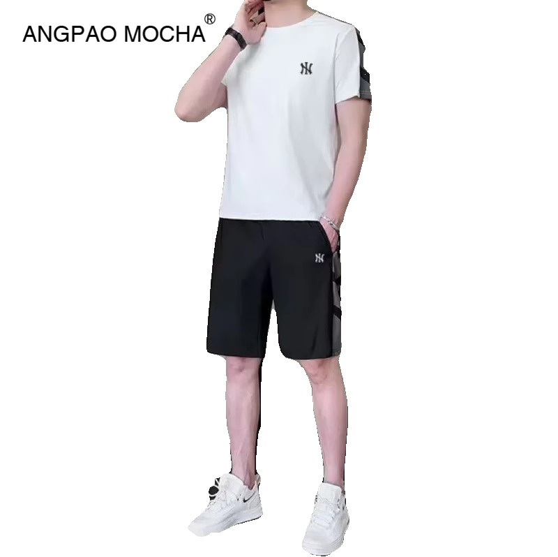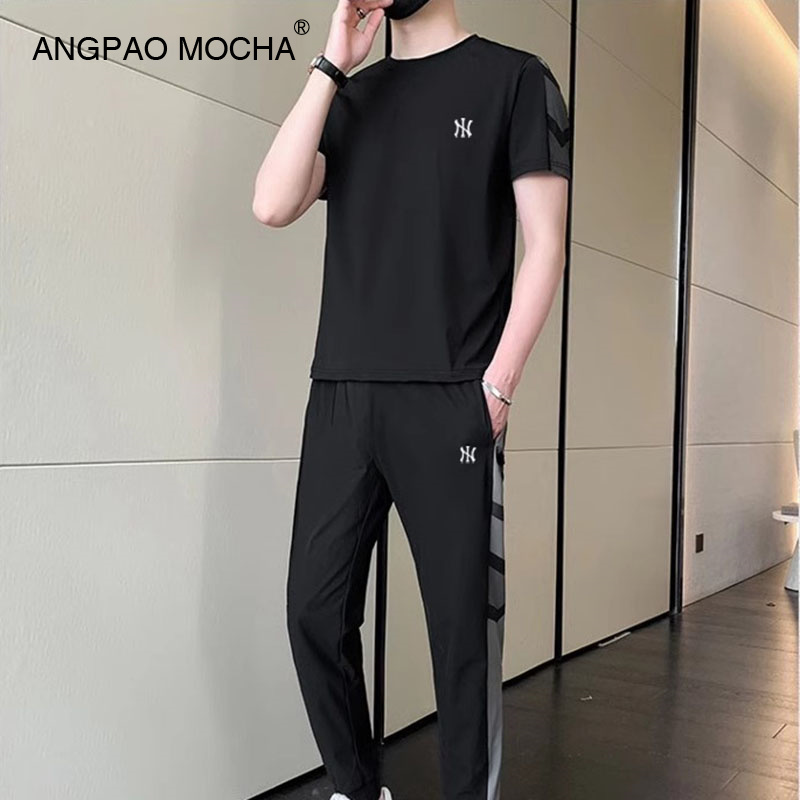 男夏季 休闲运动套装 新款 五分裤 降温速干透气T恤束脚长裤 冰丝套装