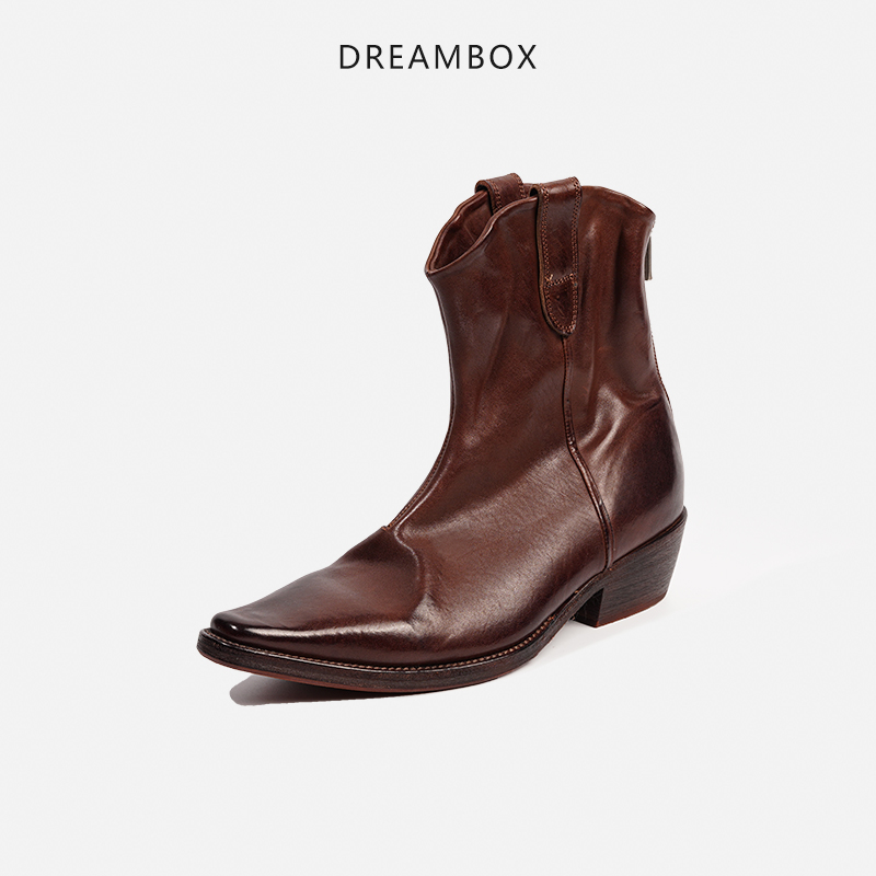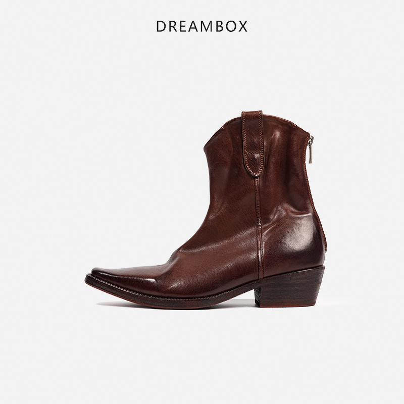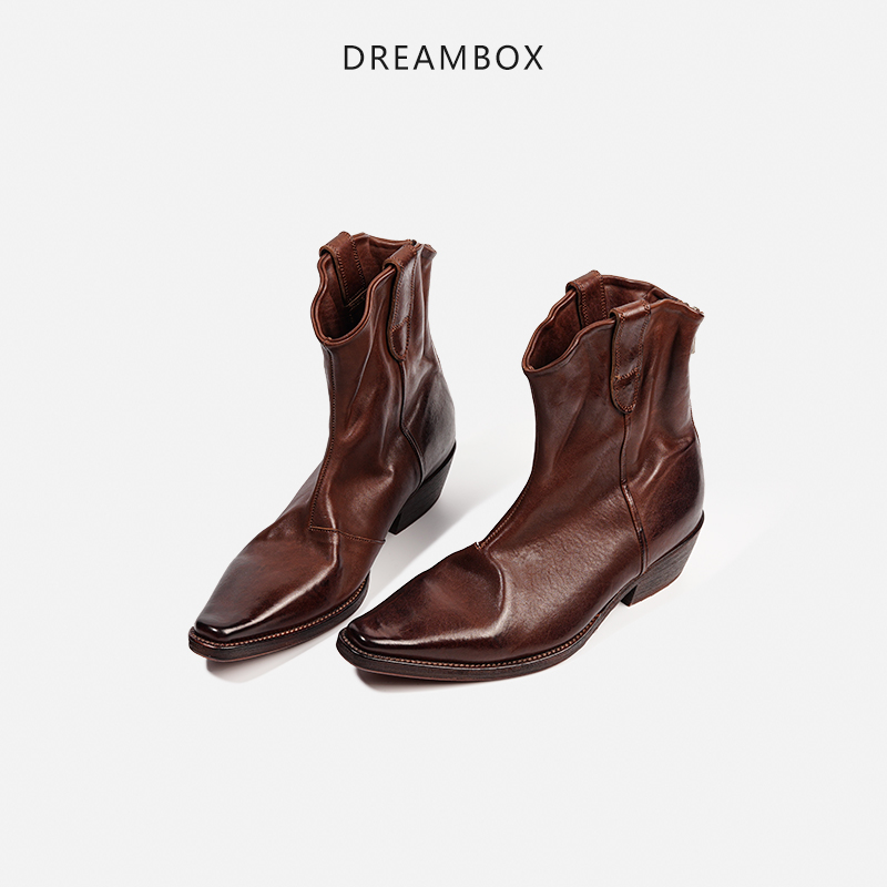 复古西部牛仔靴 美式 dreambox钧博高档马皮尖头粗跟瘦瘦靴秋季 新款