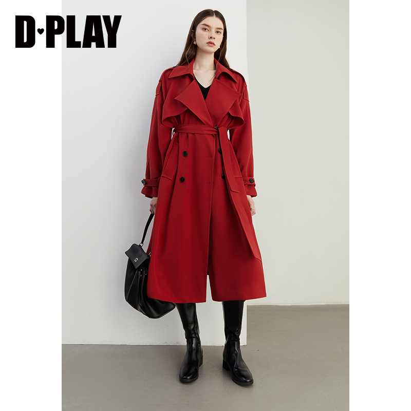 宽松外套 气质红色风衣女翻领双排扣中长款 DPLAY2025年秋季 新款