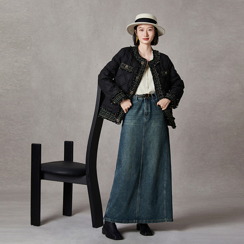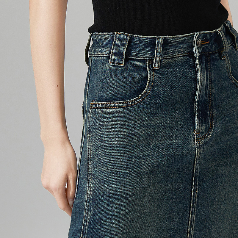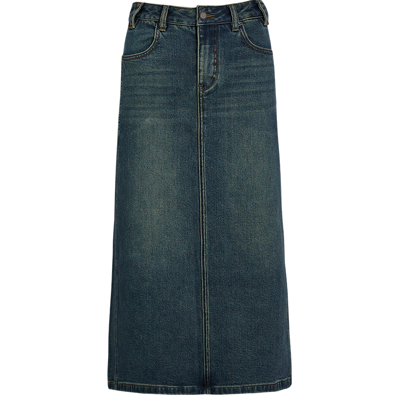 qs秸熙秋冬新款 高腰显瘦半身裙女 复古水洗做旧牛仔裙后开叉中长款