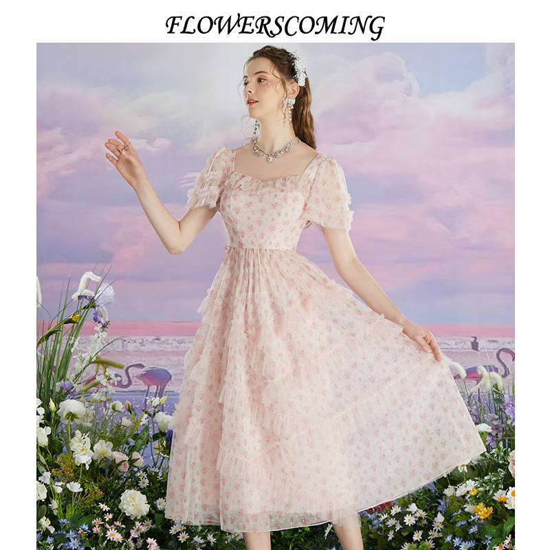超仙网纱印花连衣裙女高腰设计感公主裙 法式 花儿开了2025夏季 新款
