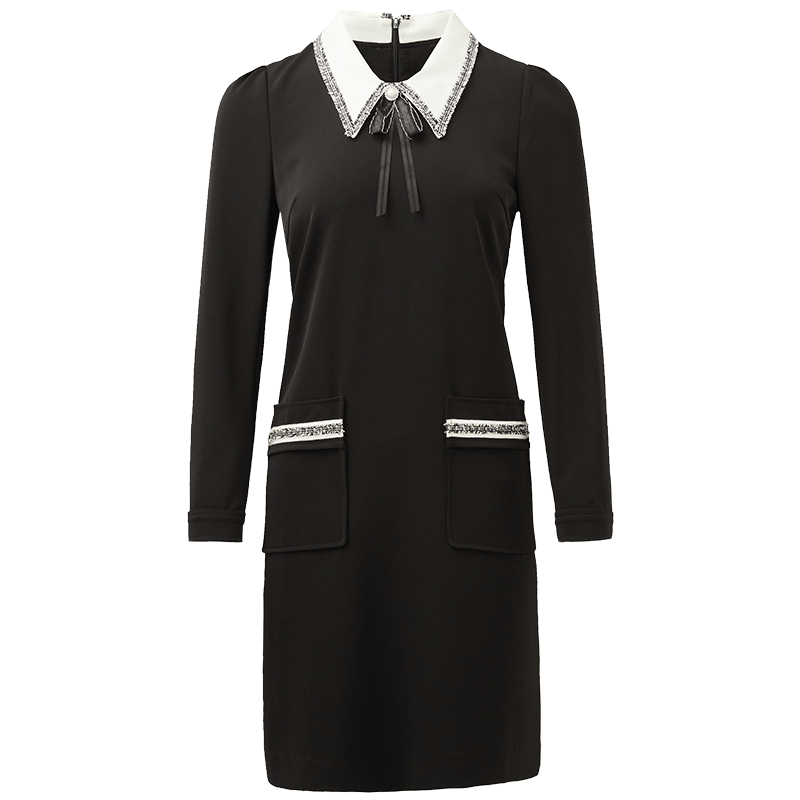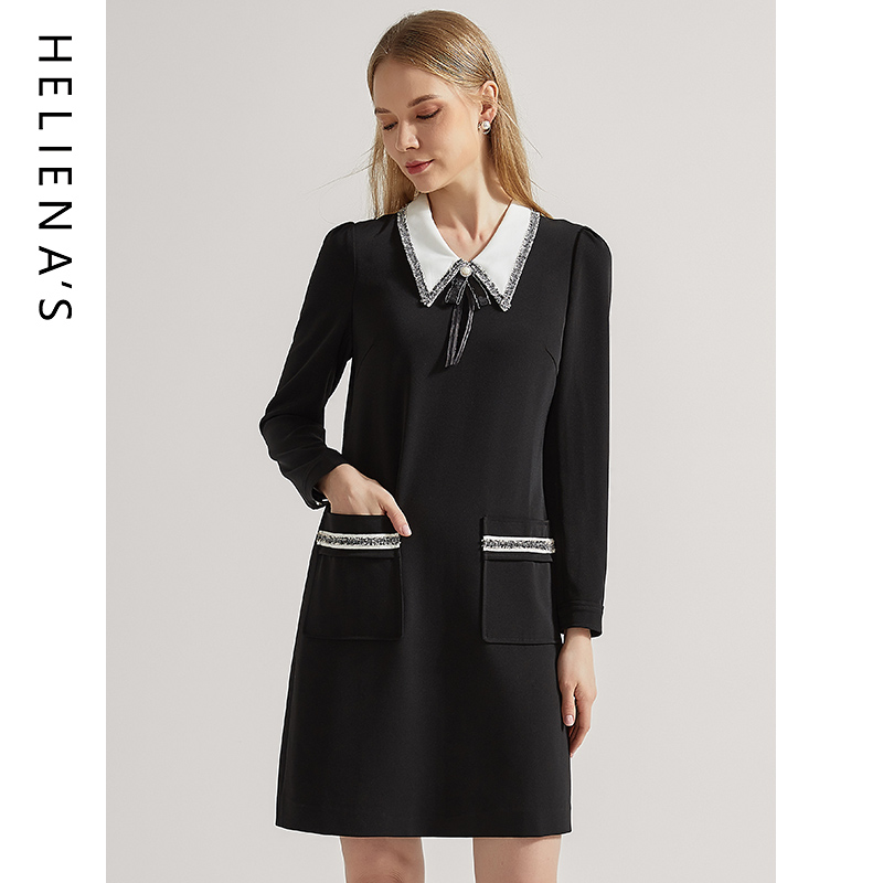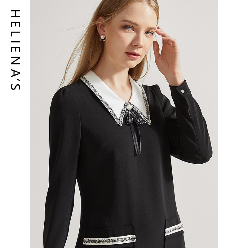 直筒连衣裙 小香风娃娃领小黑裙流行长袖 海兰丝2024秋冬新款 时尚