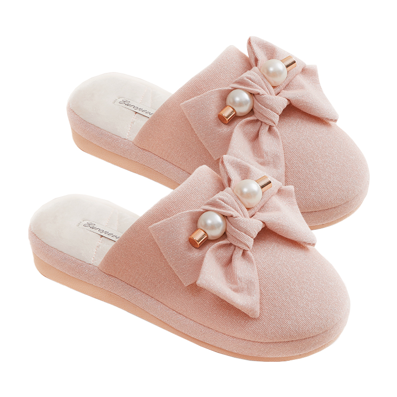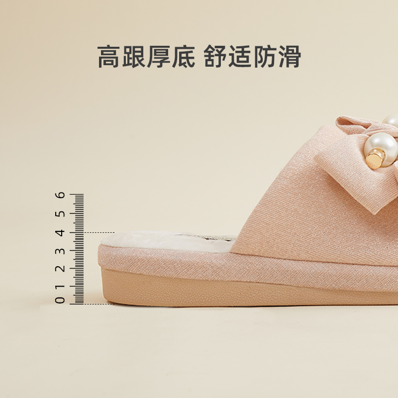 居家用防滑保暖厚底室内地板拖鞋 蝴蝶结布艺高跟棉拖鞋 女士秋冬季