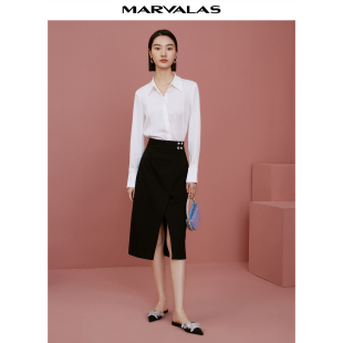 曼德诗黑色开叉半身裙2025秋季 气质设计感七分裙百搭一步裙女 新款