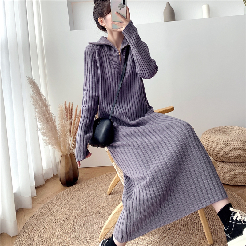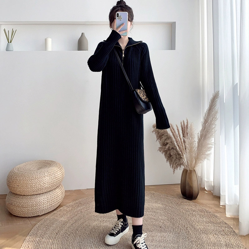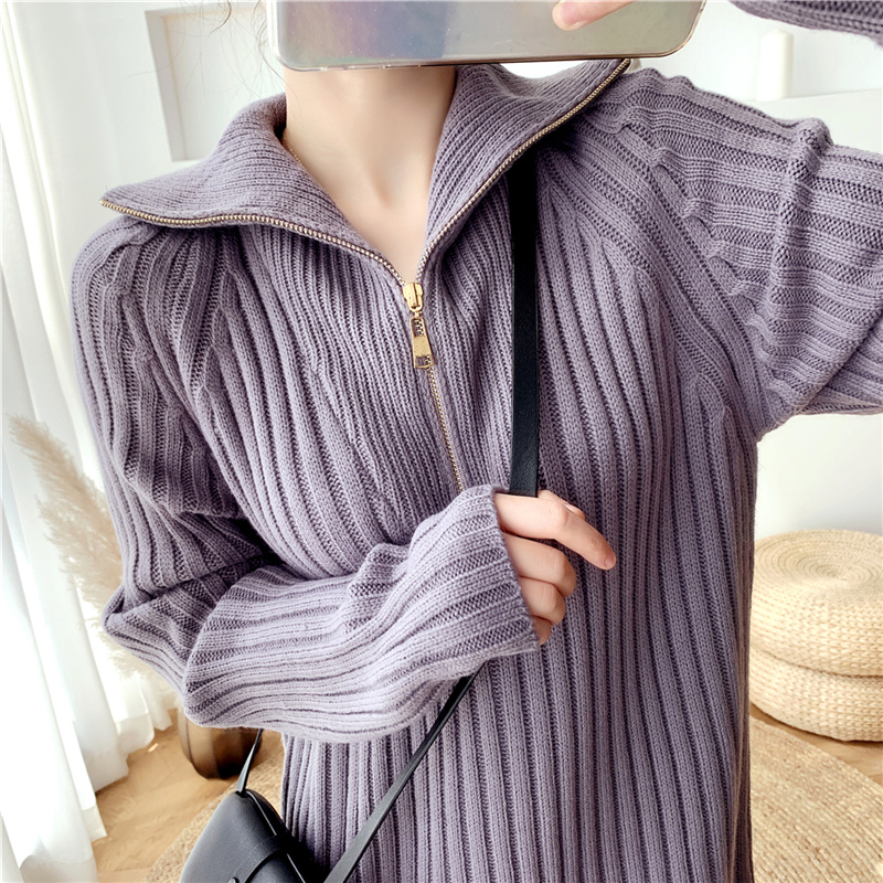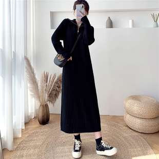 2025年新款 慵懒风宽松针织毛衣裙 直筒拉链翻领连衣裙女春秋中长款