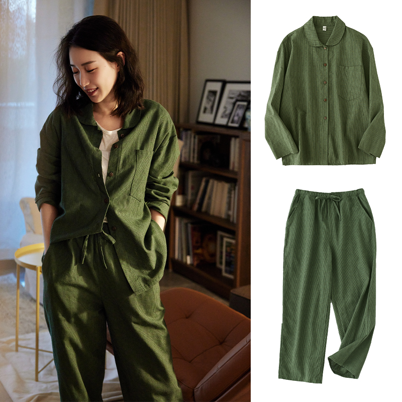 ins风睡衣高级感纯棉长袖 绿色绗缝条纹翻领宽松男家居服 长裤