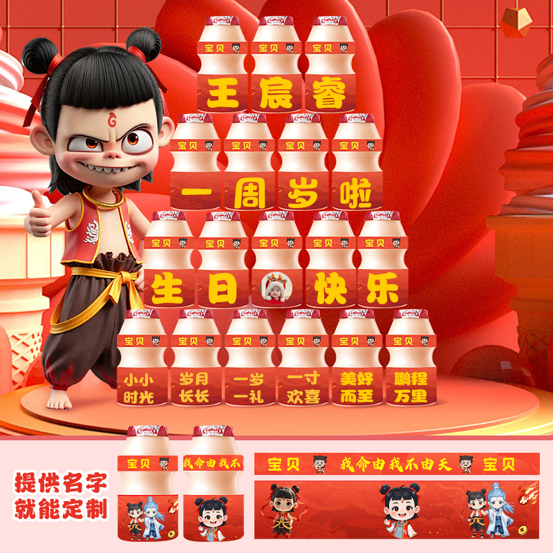 适用养乐多定制饮料贴纸周岁生日场景布置装 饰小女孩男孩儿童派对