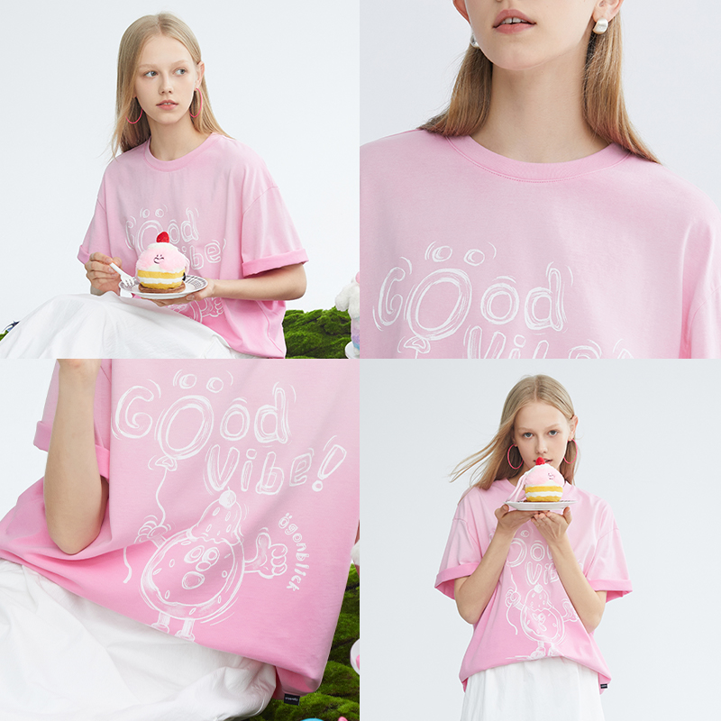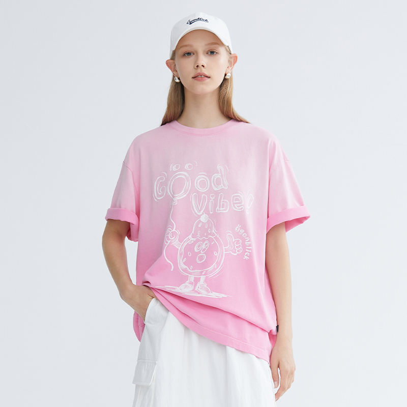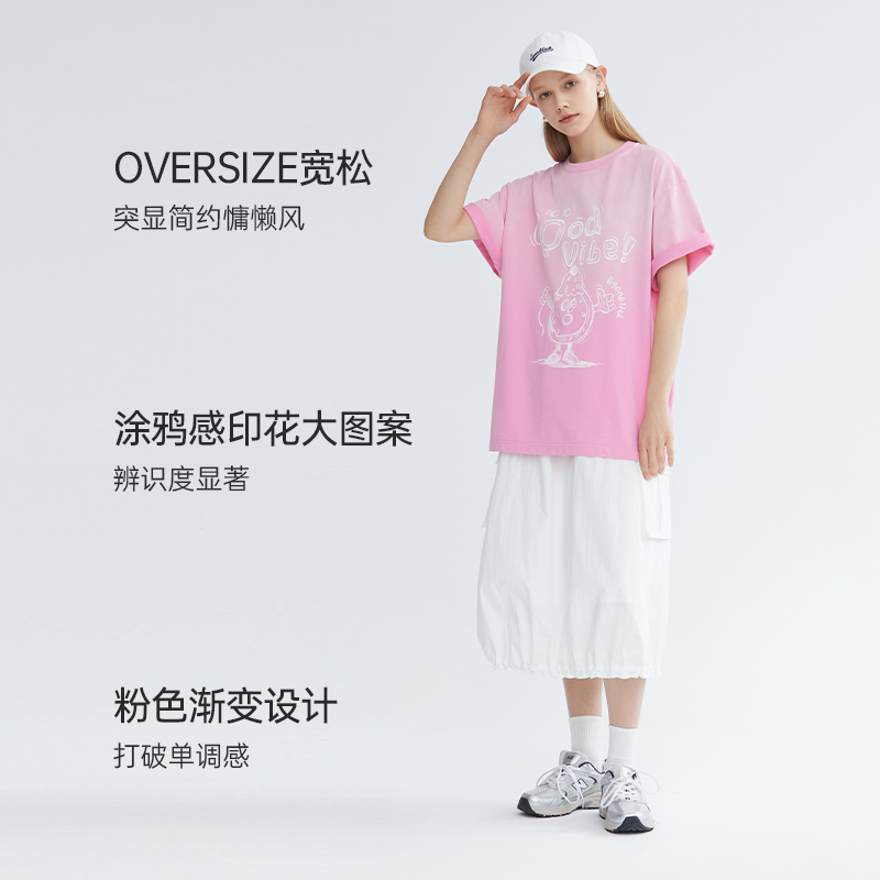 上衣 T恤女夏季 商场同款 北欧时刻趣味涂鸦感印花粉色渐变圆领短袖