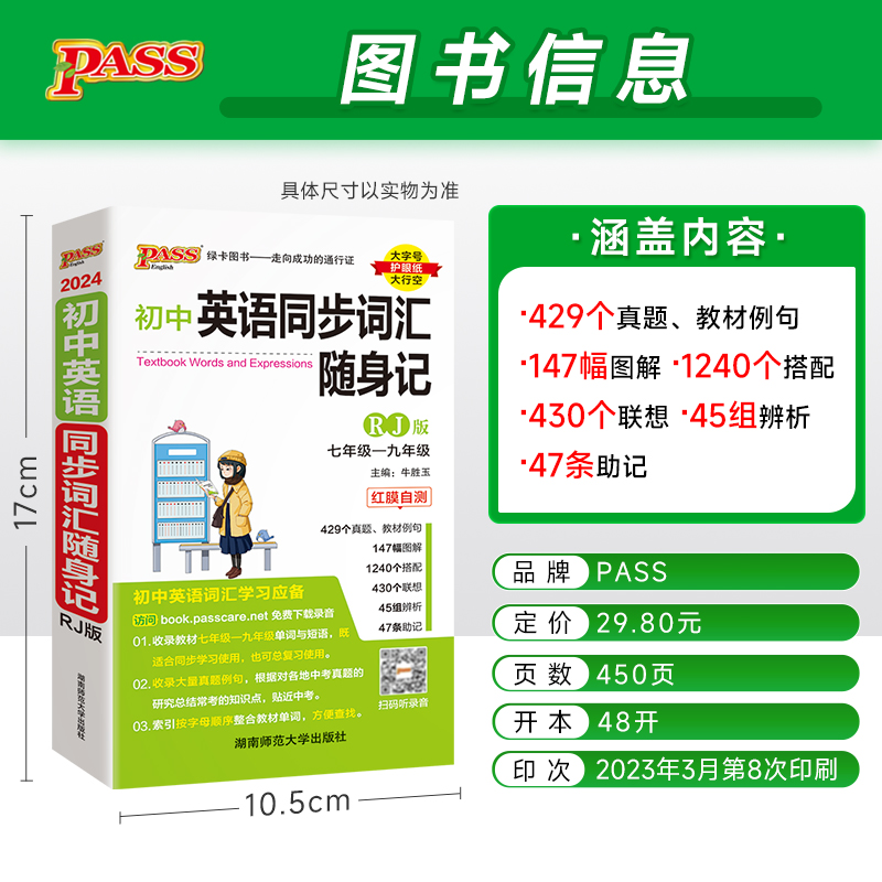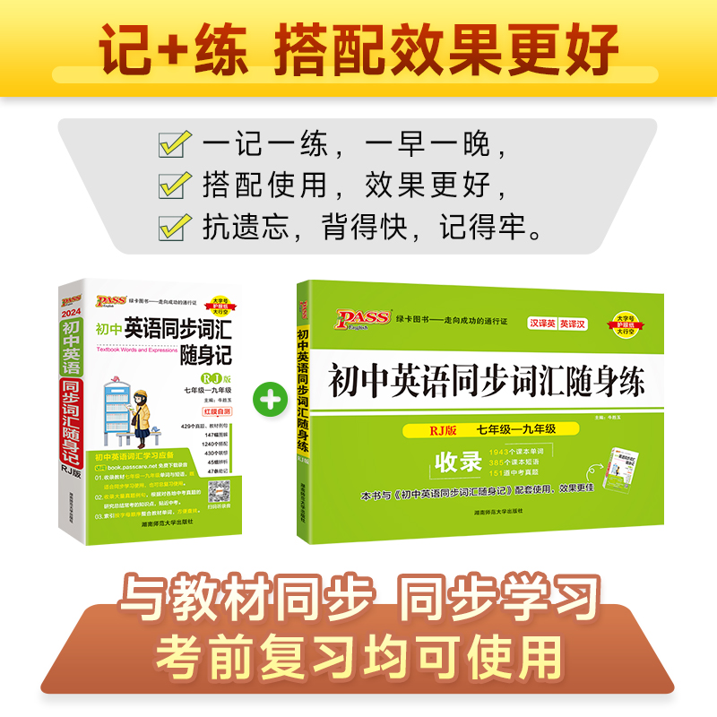 RJ人教版 2024初中英语同步词汇随身练新题型训练题单词短语专项训练练习册习题七年级八年级九年级初一二三中考高频词pass绿卡图书
