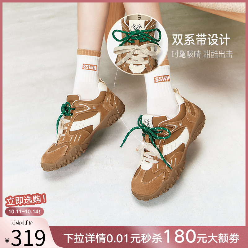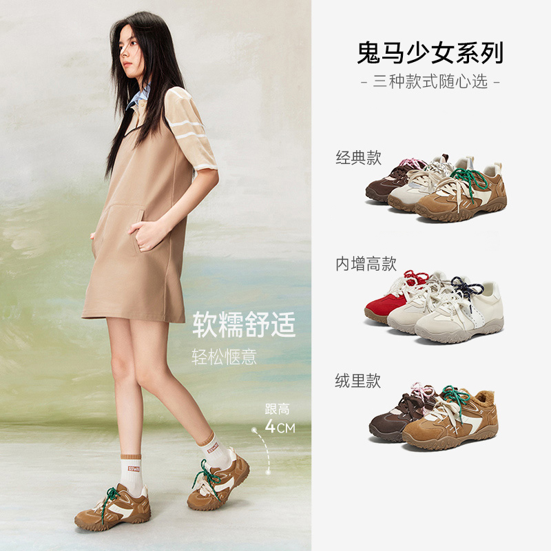 红色运动休闲阿甘鞋 德训鞋 百思图小彩糖25秋新款 女 张予曦同款