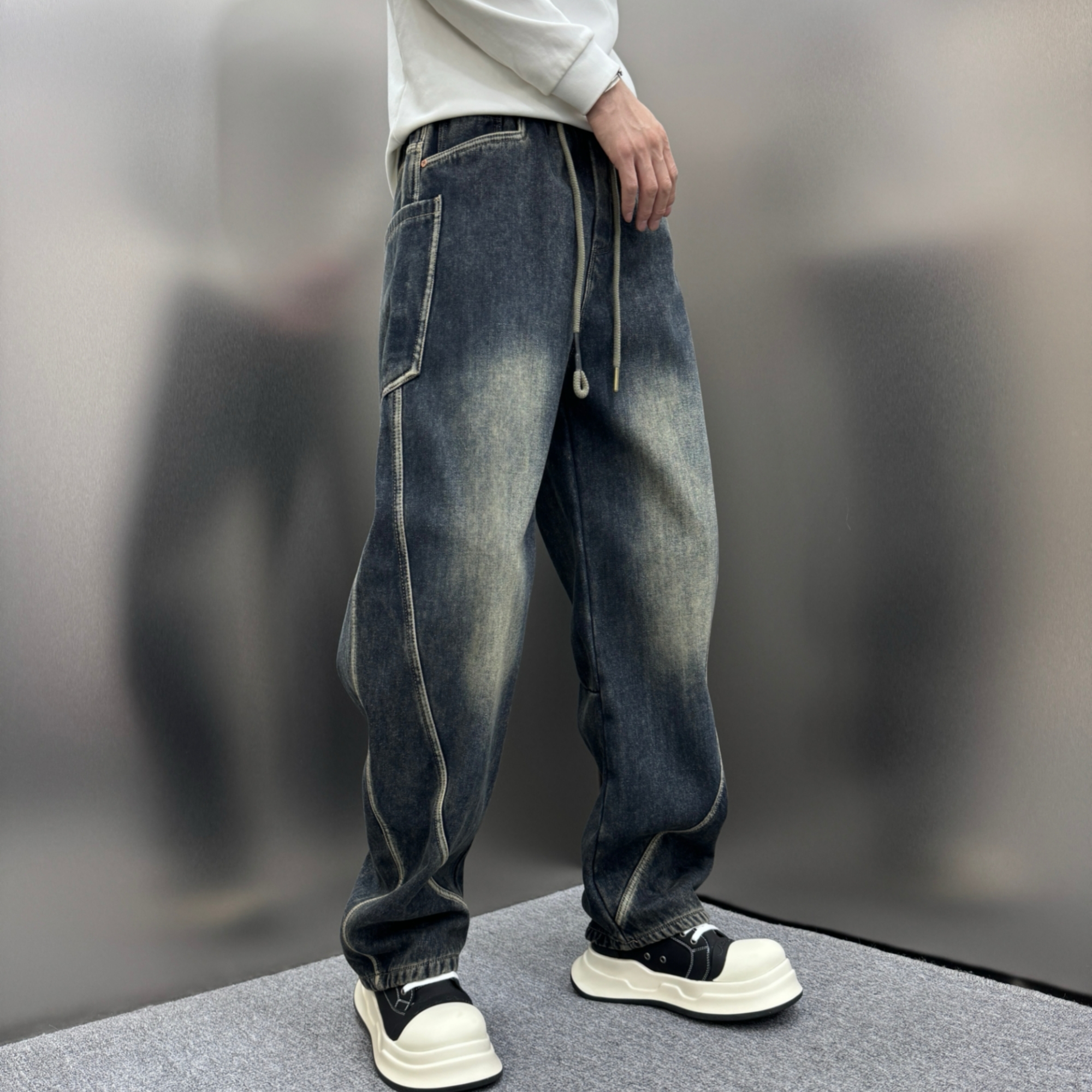牛仔裤 潮流设计感弯刀松紧腰牛仔裤 直筒裤 新款 2025年秋季 热风男士