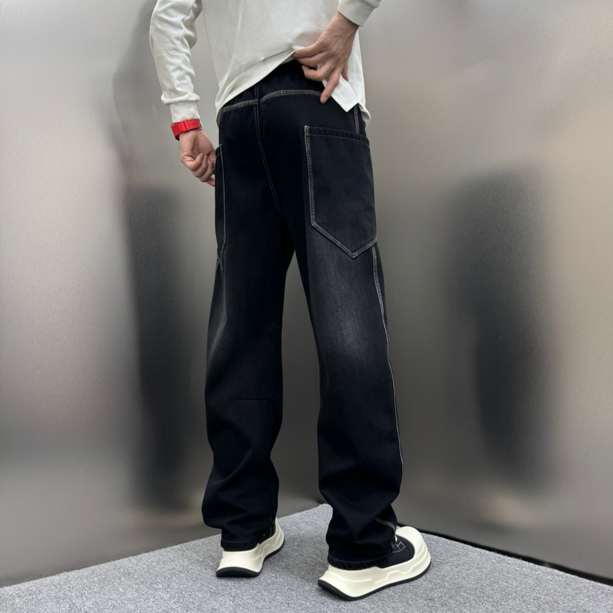 新款 秋季 男士 美式 子 回力黑色牛仔裤 复古阔腿宽松直筒休闲长裤 男款