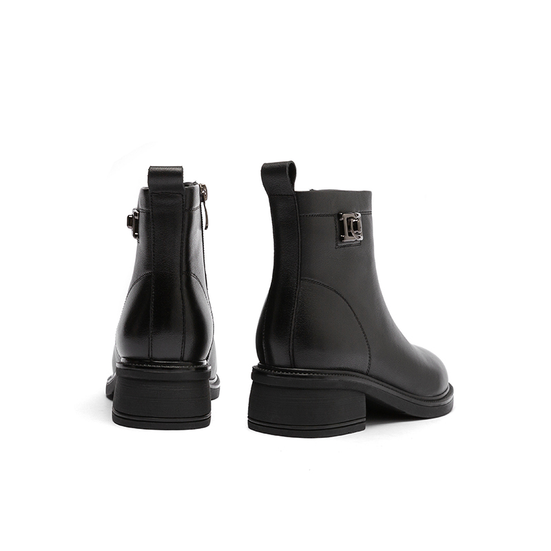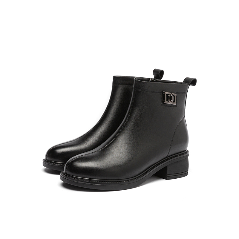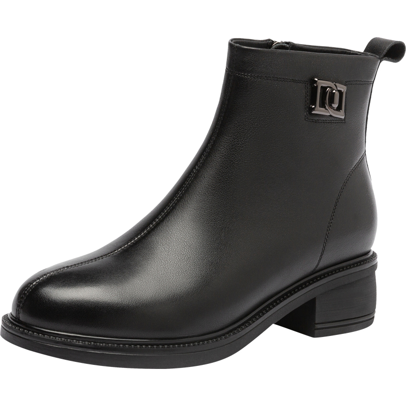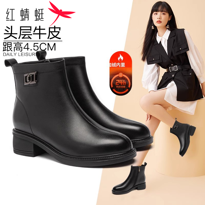 粗跟女靴保暖棉鞋 真皮短靴女 加绒靴子高跟皮靴 秋冬款 红蜻蜓女鞋
