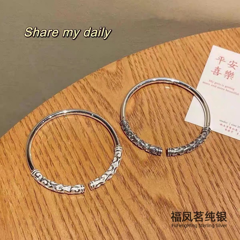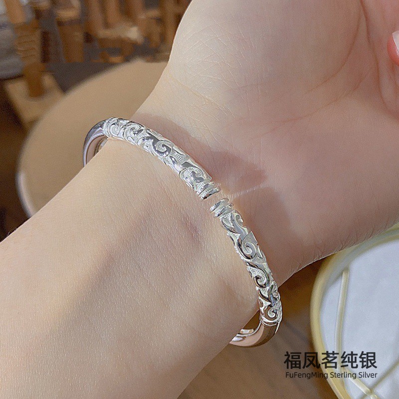 周六福手镯S999足银福云祥纹莲花实心镯子优雅气质节日礼物