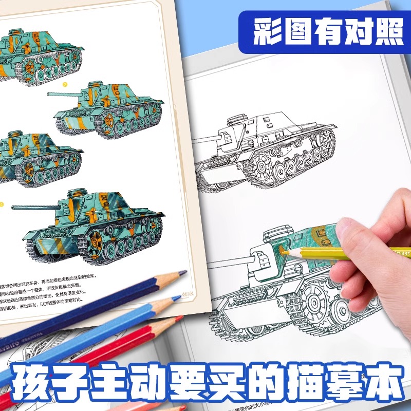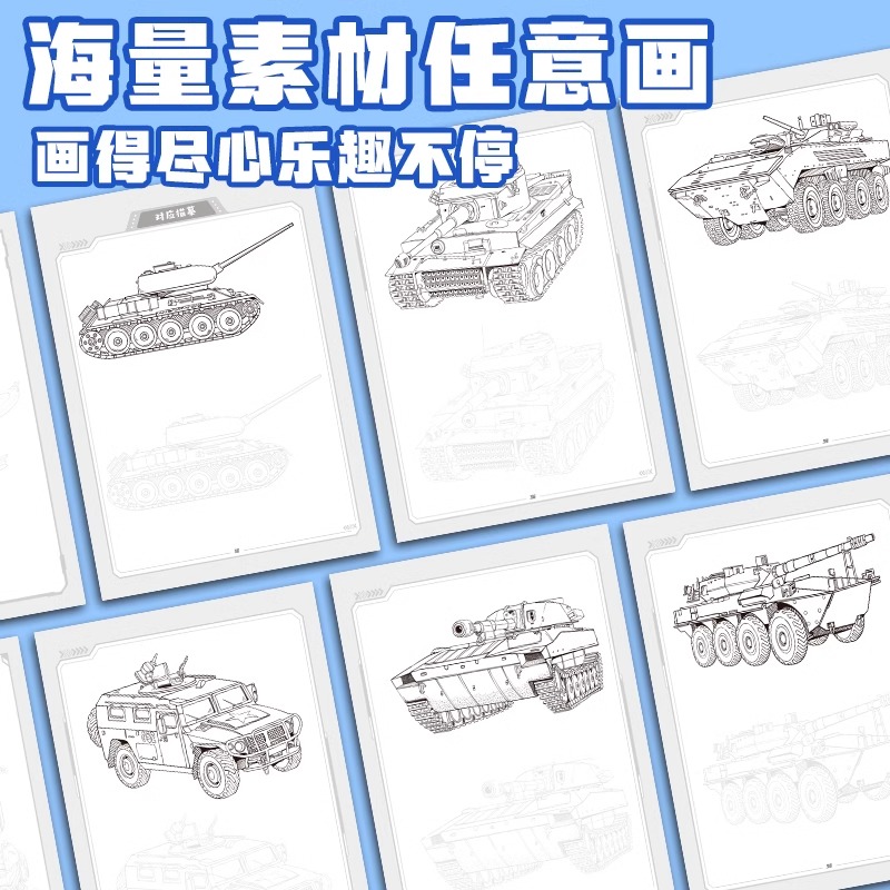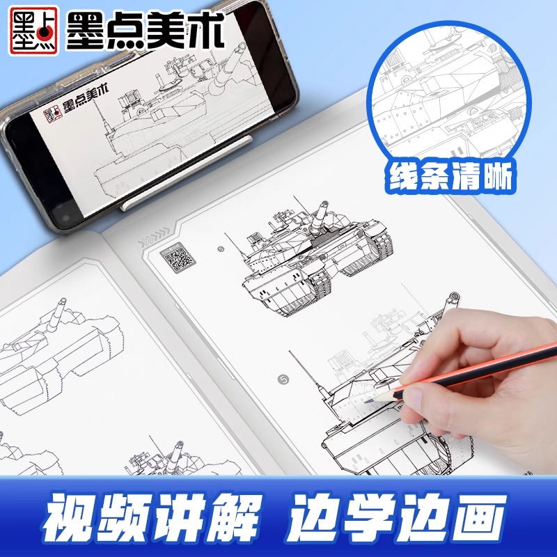 浙江人民美术出版 临摹素描绘画本视频教程小学生素描本线描画册儿童进化篇图画本涂色本 社 跟我学成为线描达人坦克战车 墨点美术