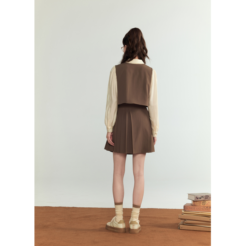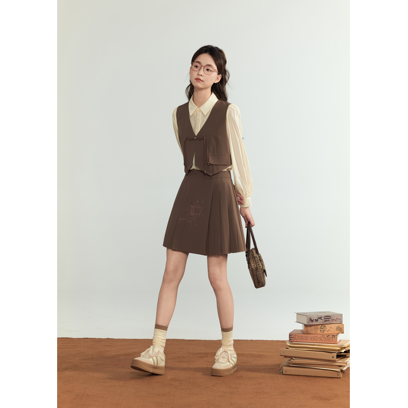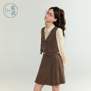 衬衫 新款 盘扣马甲背心短款 女秋季 刺绣高腰百褶裙套装 紫涵复古长袖