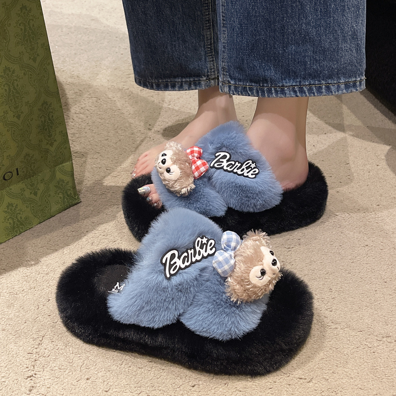 外穿厚底防滑百搭懒人棉拖鞋 女秋冬季 气卡通雪莉玫玩偶毛毛拖鞋 元