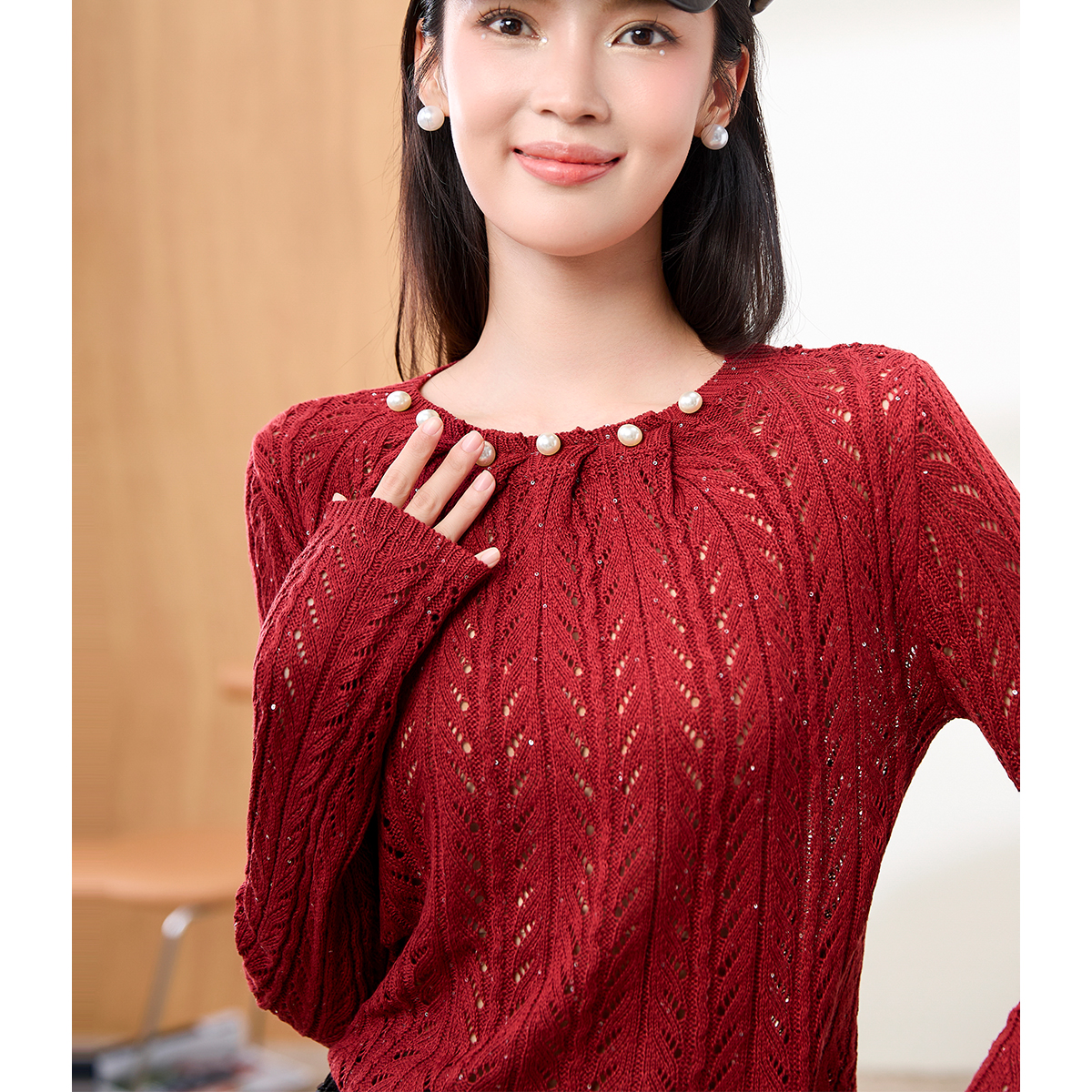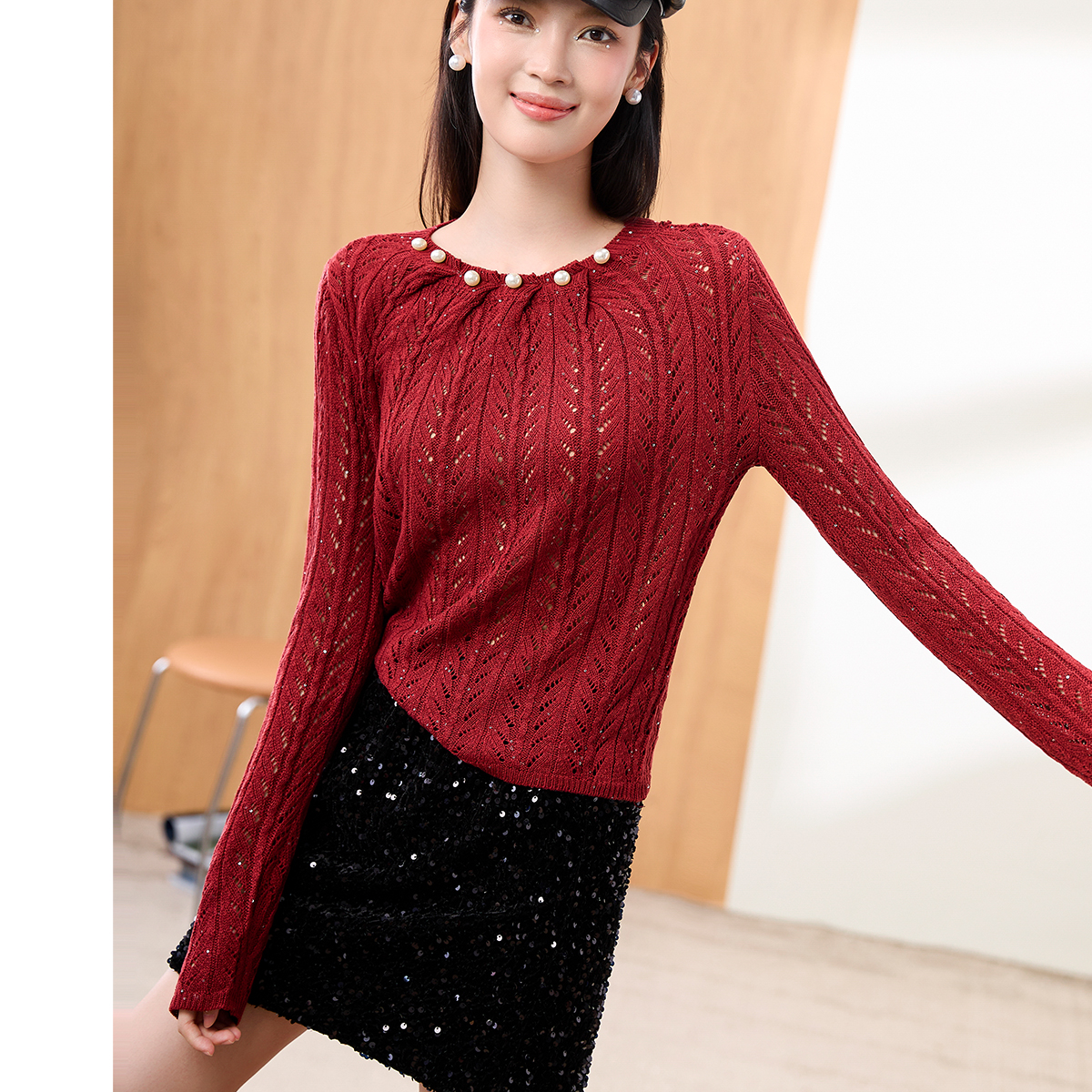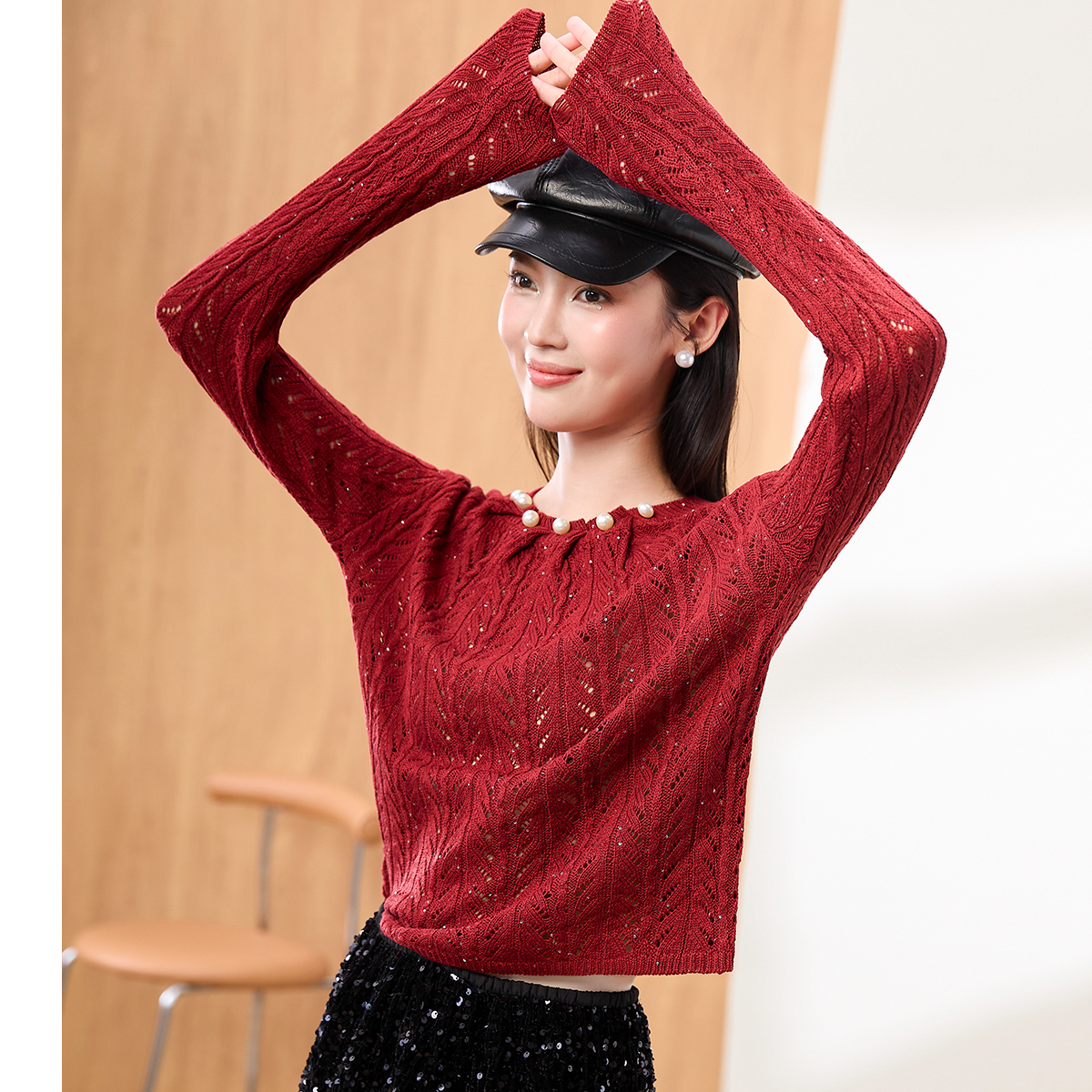 2025秋上新红色毛衣女春秋外穿宽松复古圆领珍珠慵懒套头针织衫