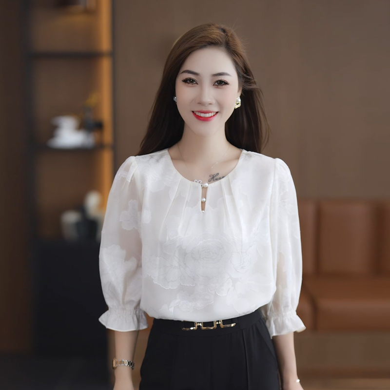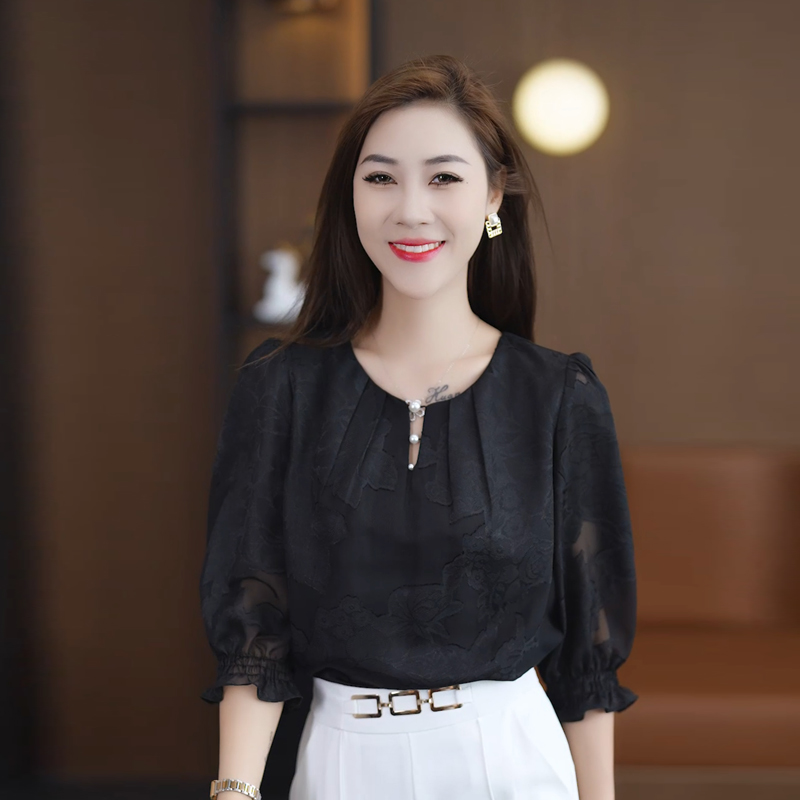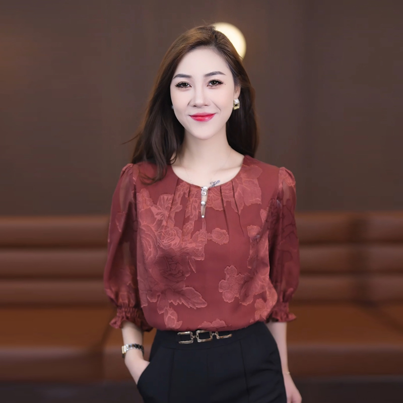 时尚 女早秋2025年新款 洋气小衫 夏季 上衣 七分袖 减龄中袖 印花雪纺衫