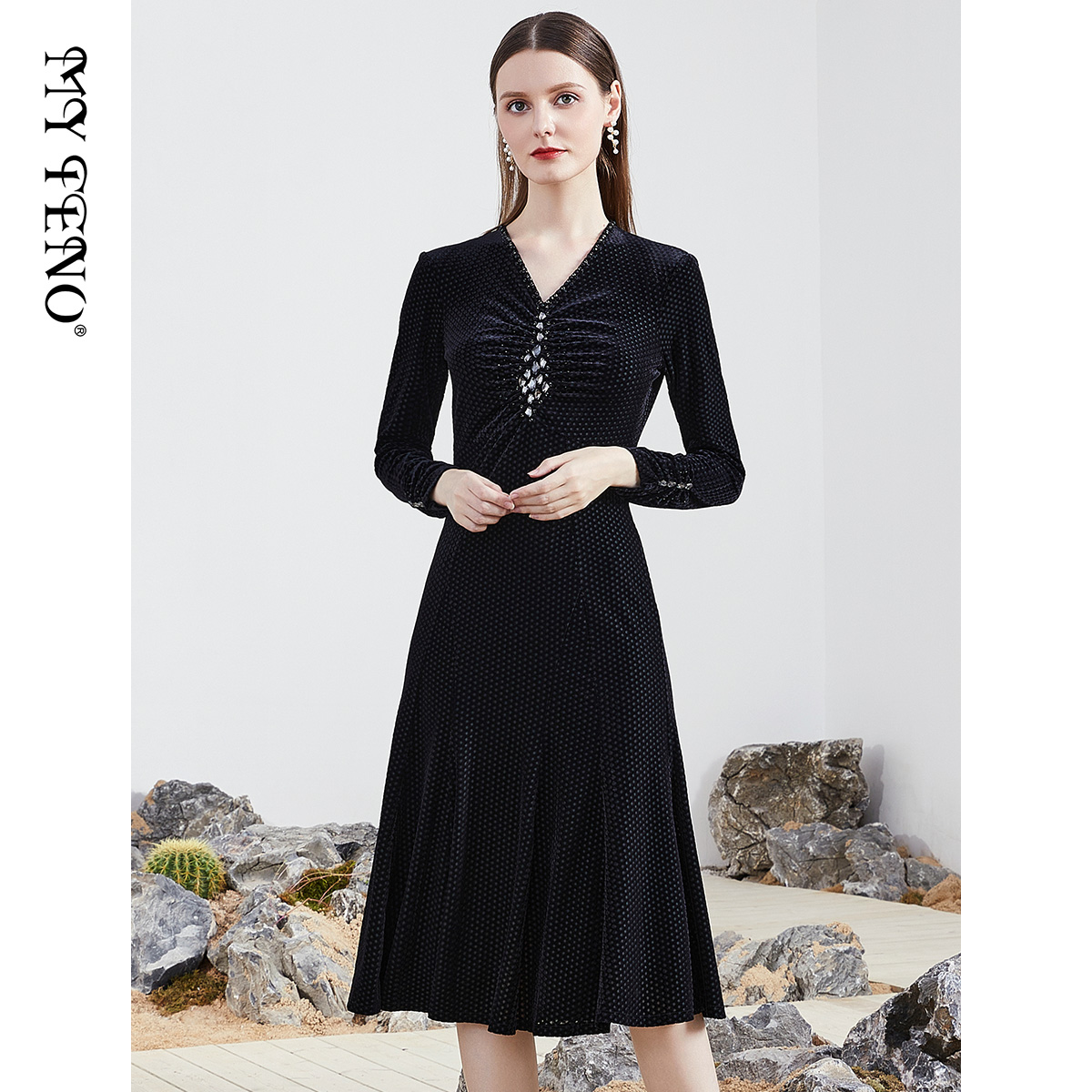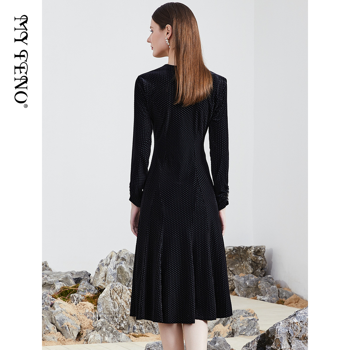 歌莉娅连衣裙女秋季 高级感气质蕾丝拼接黑色丝绒裙1C1R4H470 新款