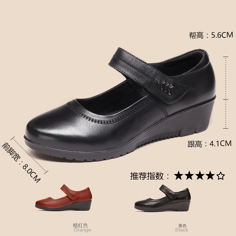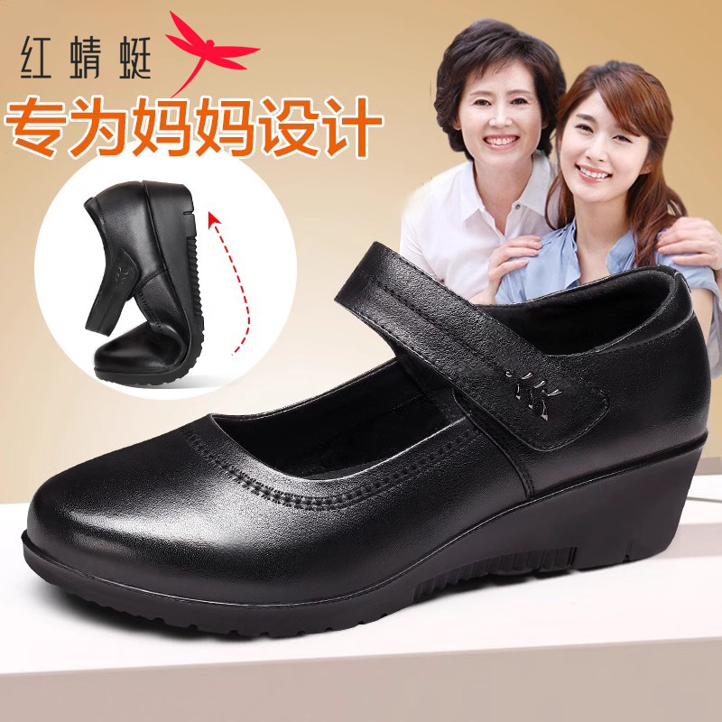软底老人女鞋 红蜻蜓中老年妈妈鞋 单鞋 浅口坡跟女款 真皮老年人皮鞋